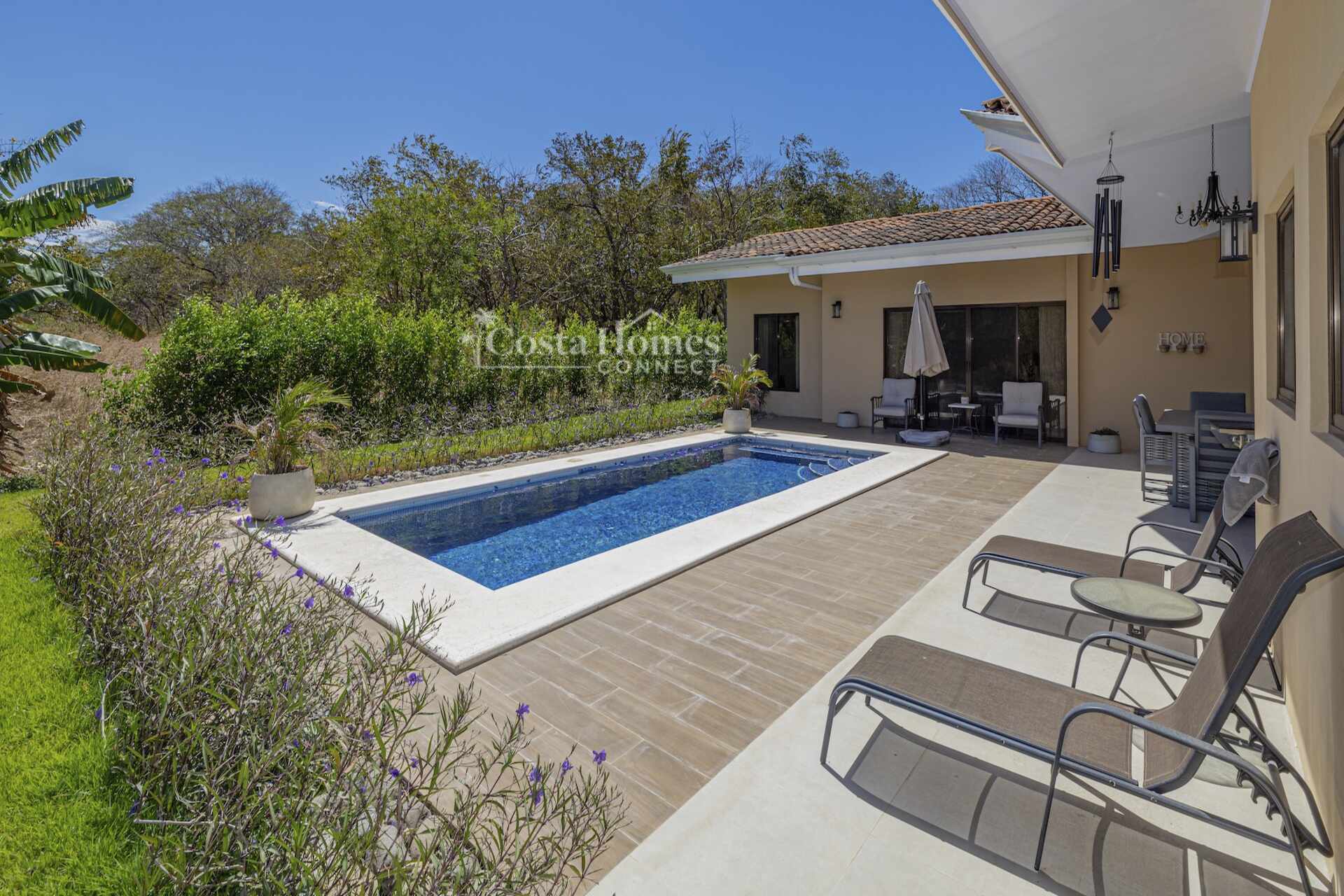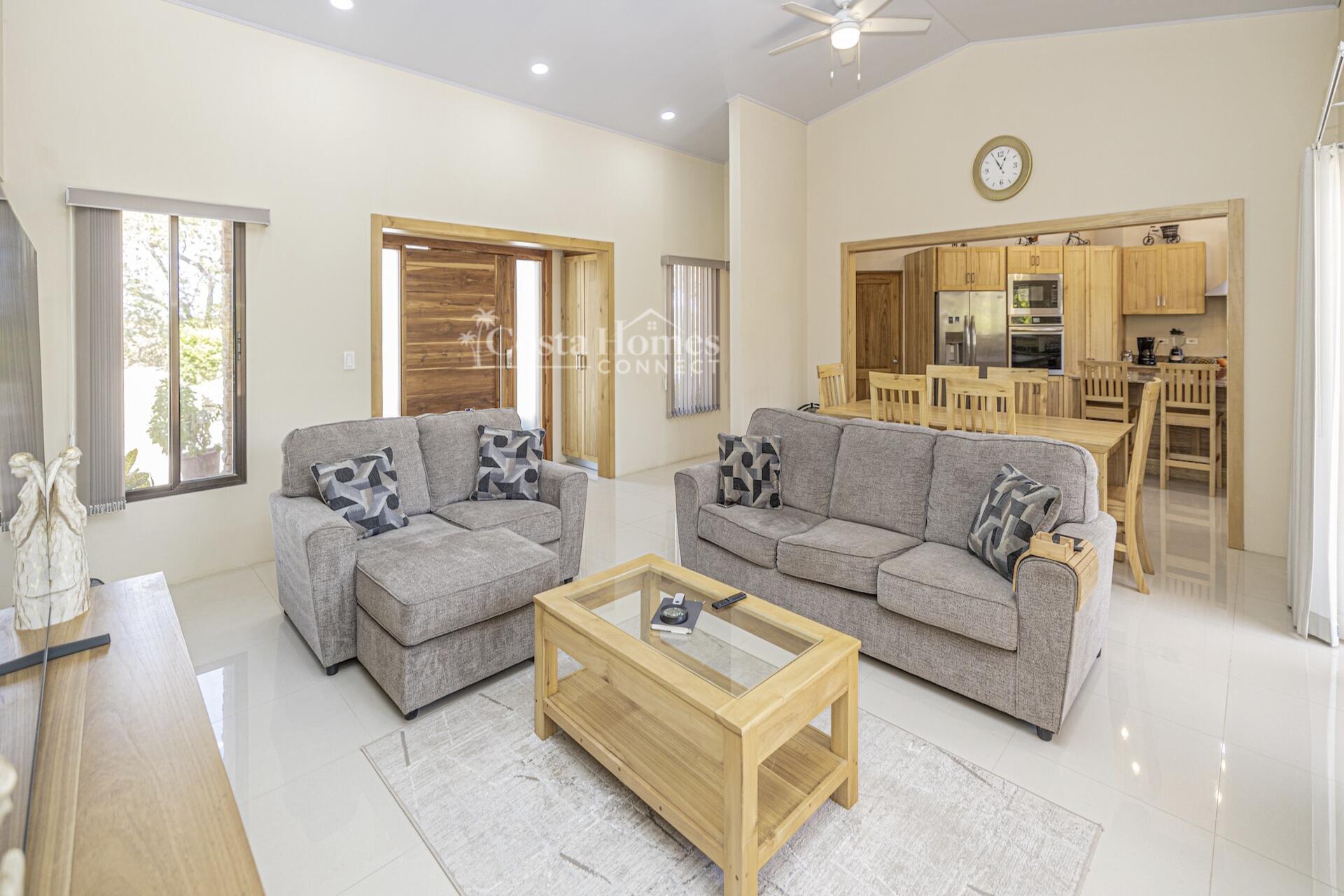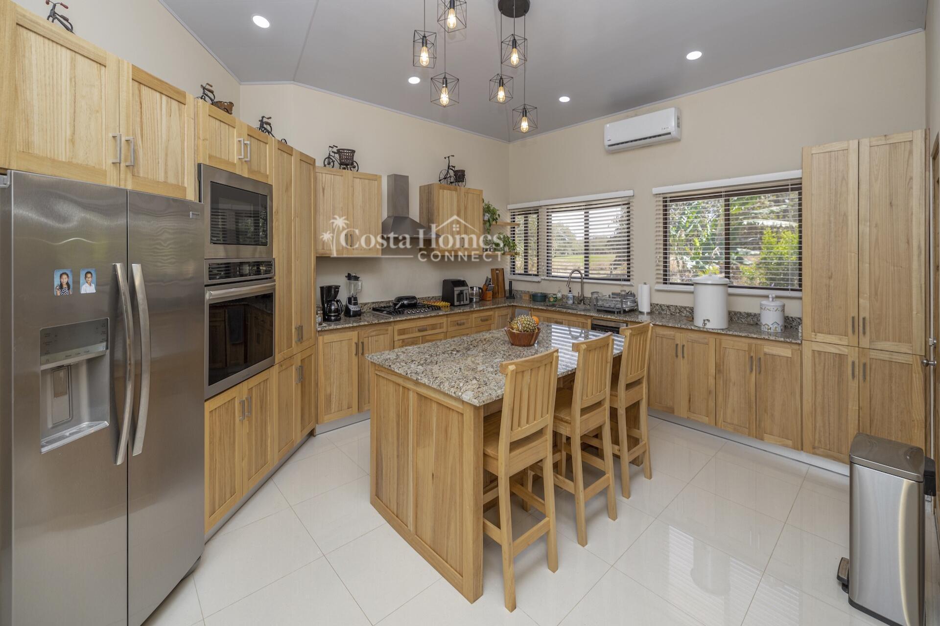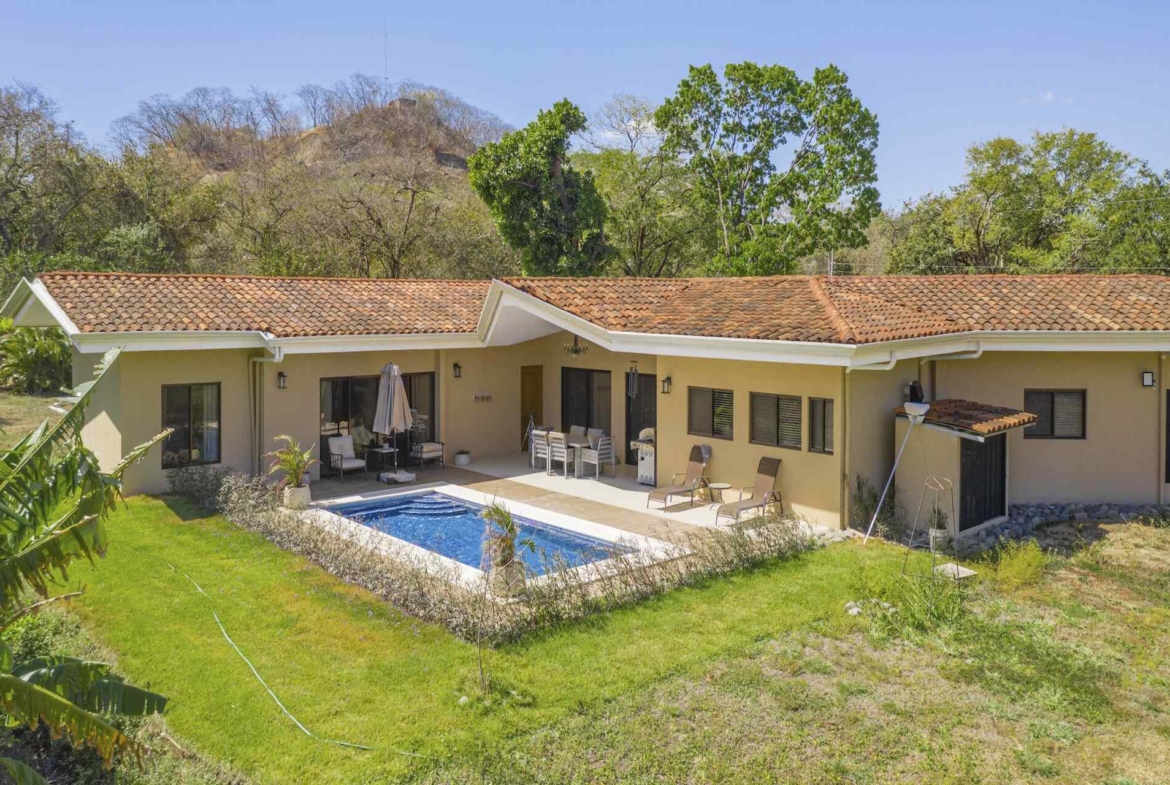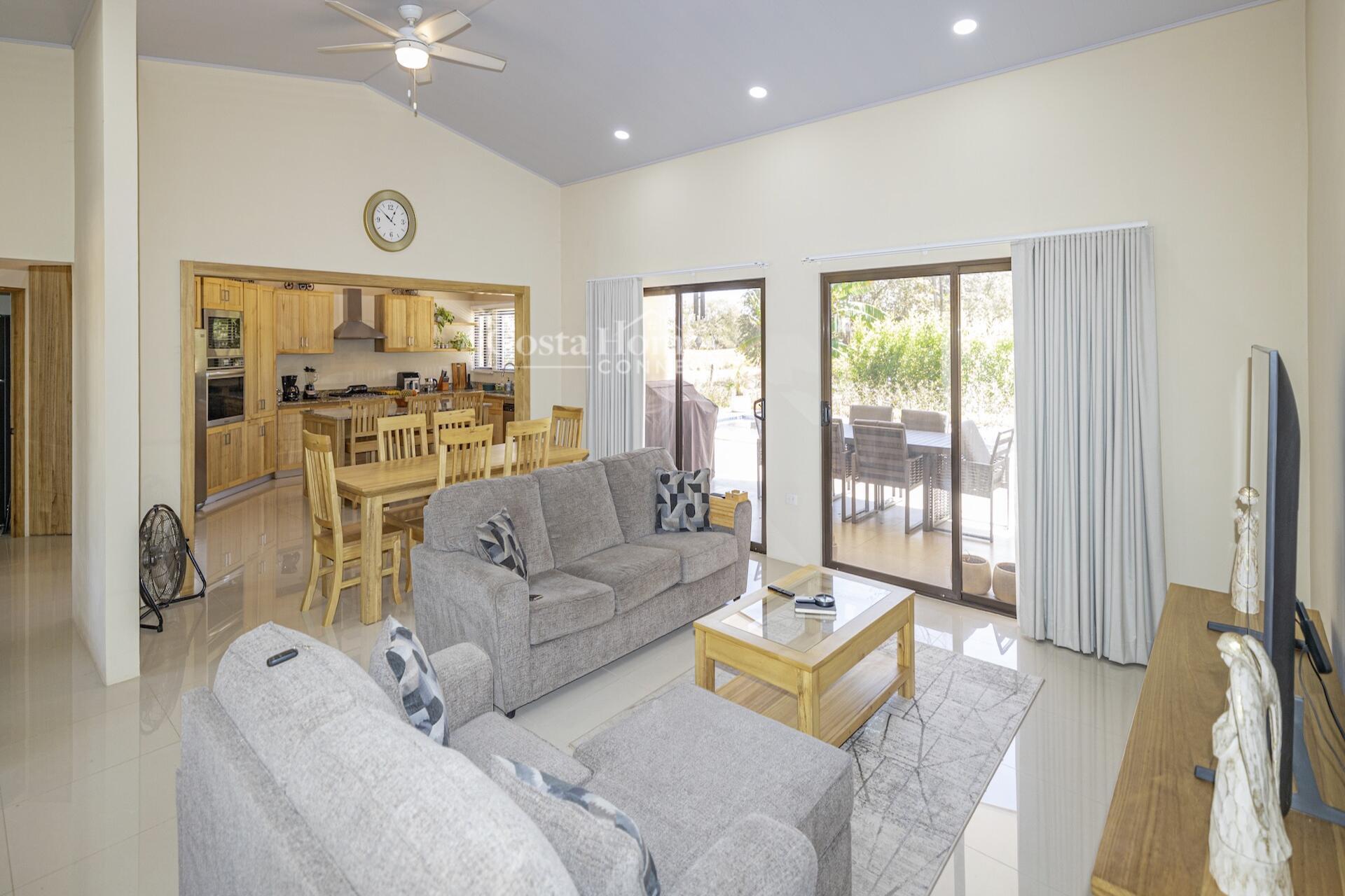 Set within the tranquil and private Vista Ridge community near Playas del Coco, this beautifully designed one-level estate home offers 3 bedrooms and 3.5 baths across 2,900 square feet including the attached garage and expansive covered terraces, all positioned on an estate-sized 6,309 square meter (1.5 acre) mostly flat lot with nature and mountain views and abundant irrigation from a private artesian well. The light and airy interior showcases light-colored custom wood cabinetry, a large chef’s kitchen with a huge center island and oversized pantry, and defined yet seamlessly connected dining and living spaces that flow effortlessly to the spacious covered terrace, oversized pool, and generous yard—perfect for indoor-outdoor living.