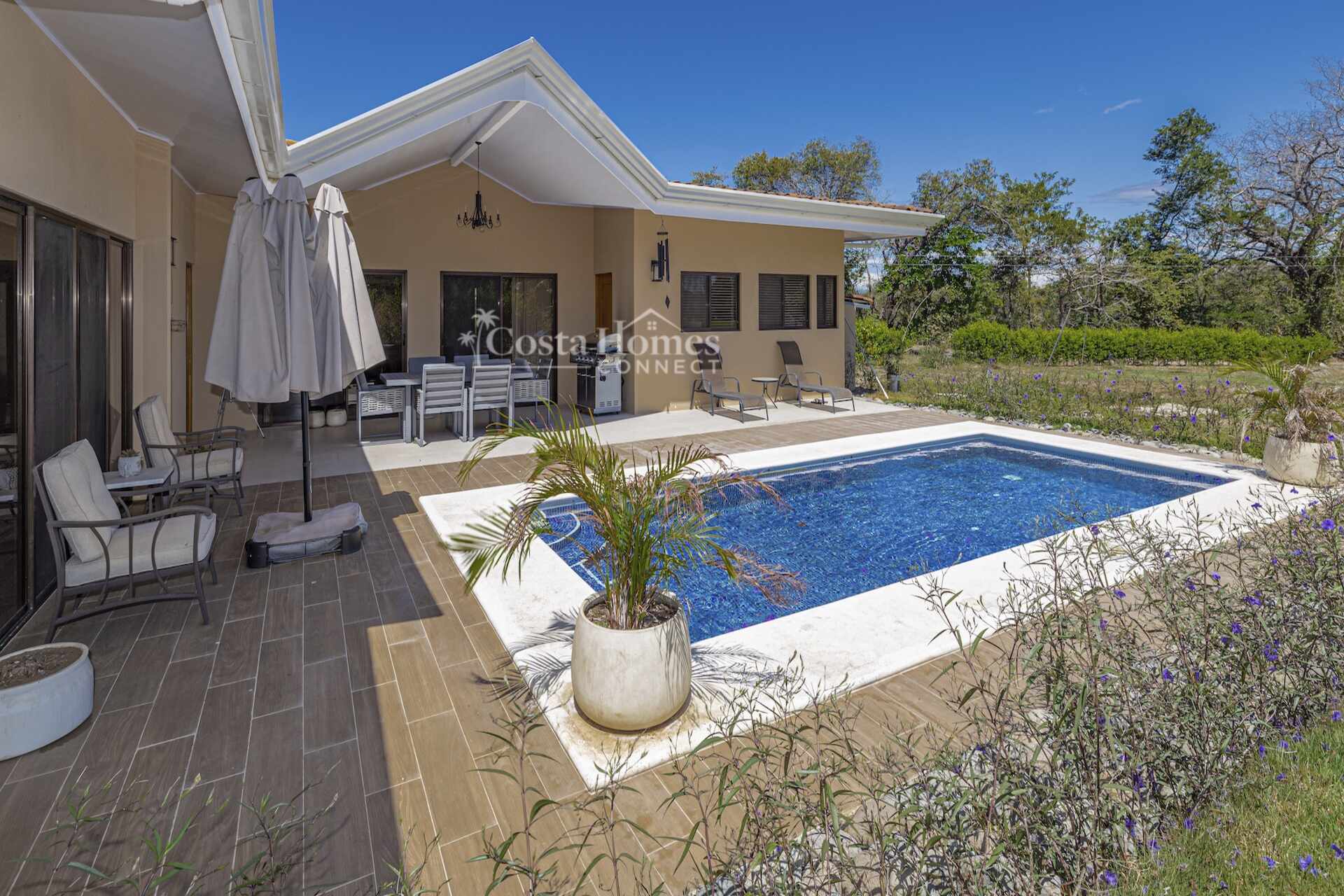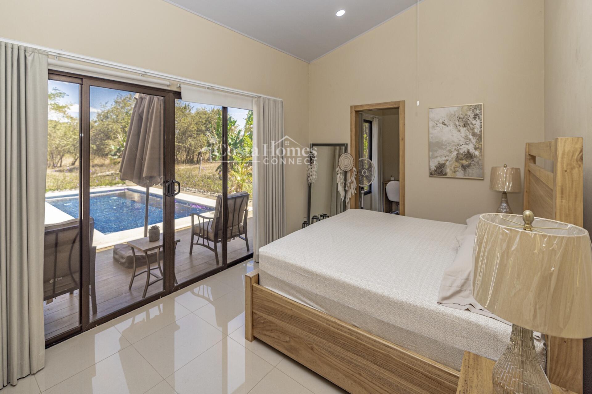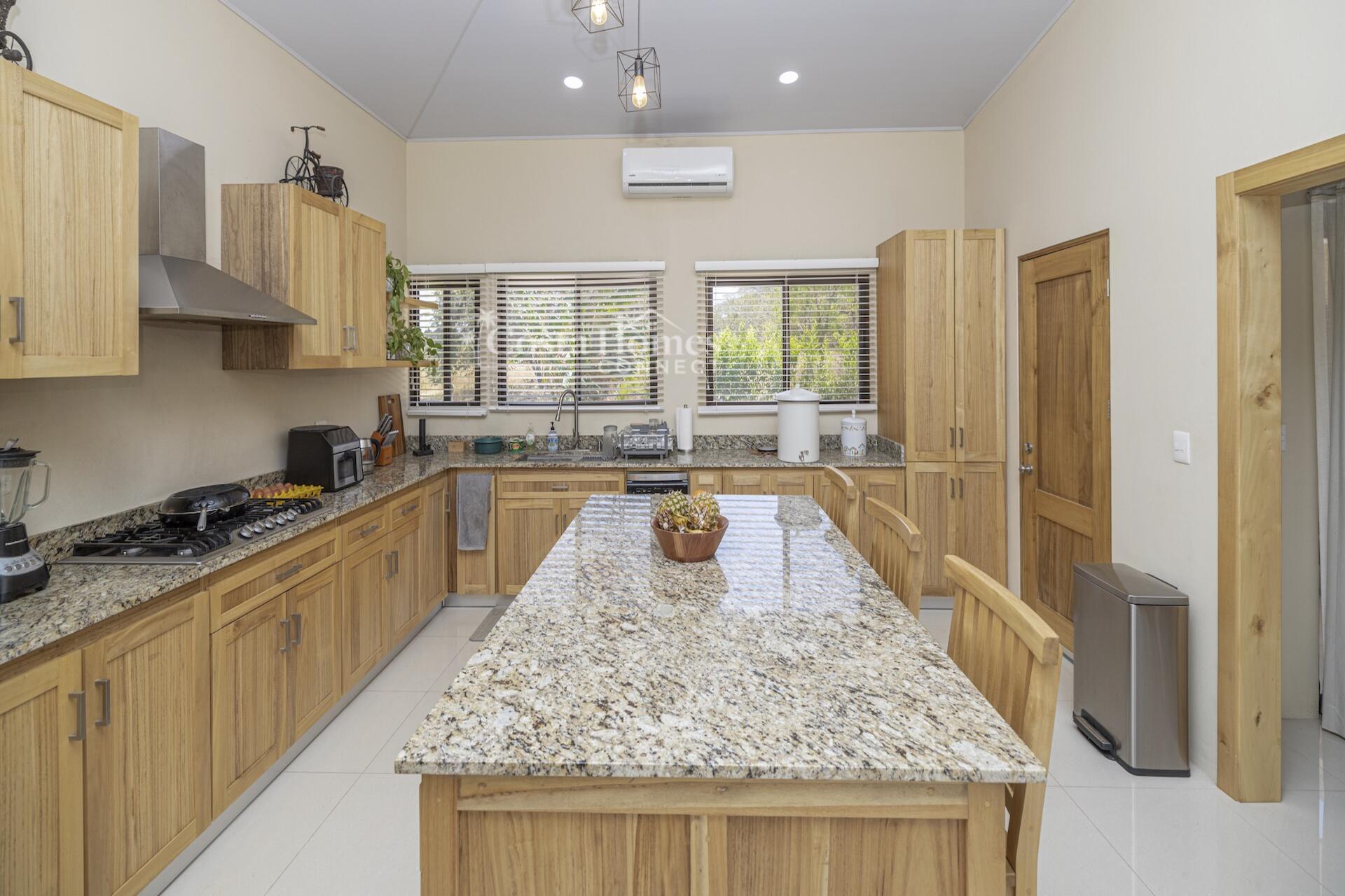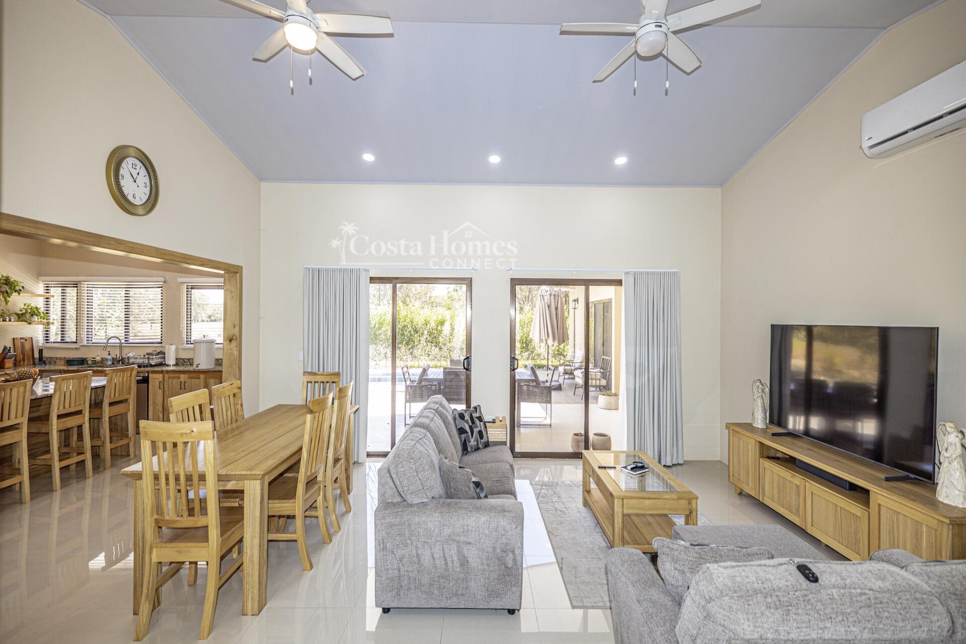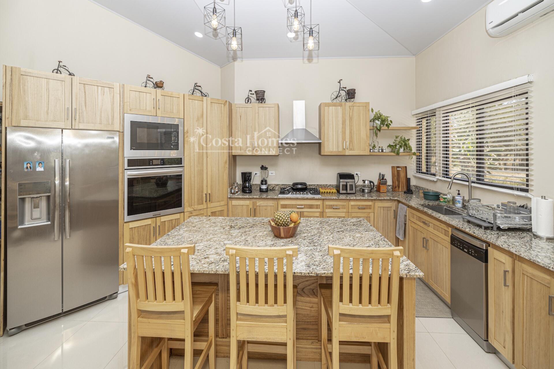 Set within the tranquil and private Vista Ridge community near Playas del Coco, this beautifully designed one-level estate home offers 3 bedrooms and 3.5 baths across 2,900 square feet including the attached garage and expansive covered terraces, all positioned on an estate-sized 6,309 square meter (1.5 acre) mostly flat lot with nature and mountain views and abundant irrigation from a private artesian well. The light and airy interior showcases light-colored custom wood cabinetry, a large chef’s kitchen with a huge center island and oversized pantry, and defined yet seamlessly connected dining and living spaces that flow effortlessly to the spacious covered terrace, oversized pool, and generous yard—perfect for indoor-outdoor living.