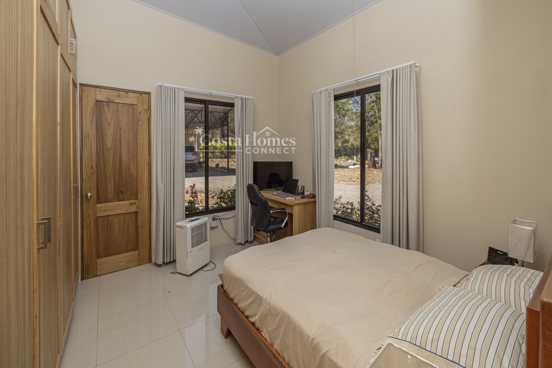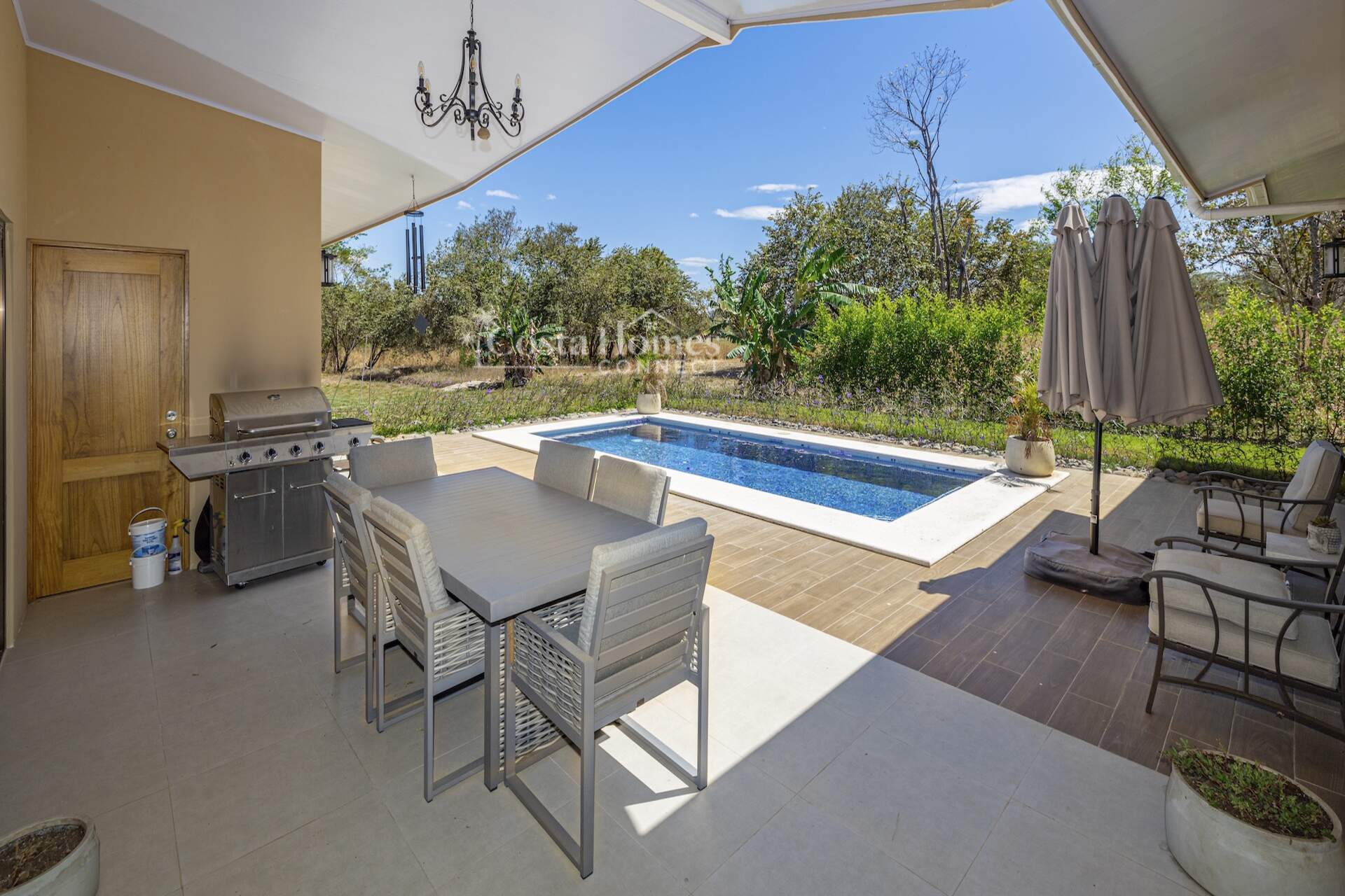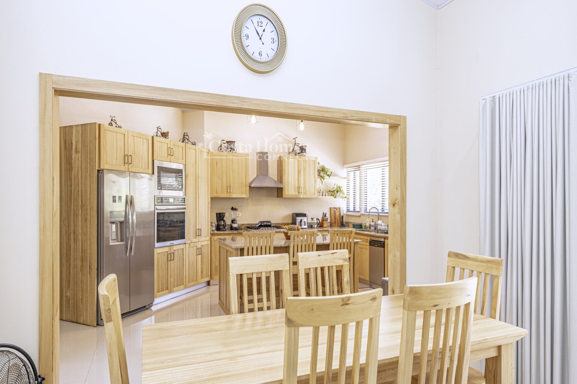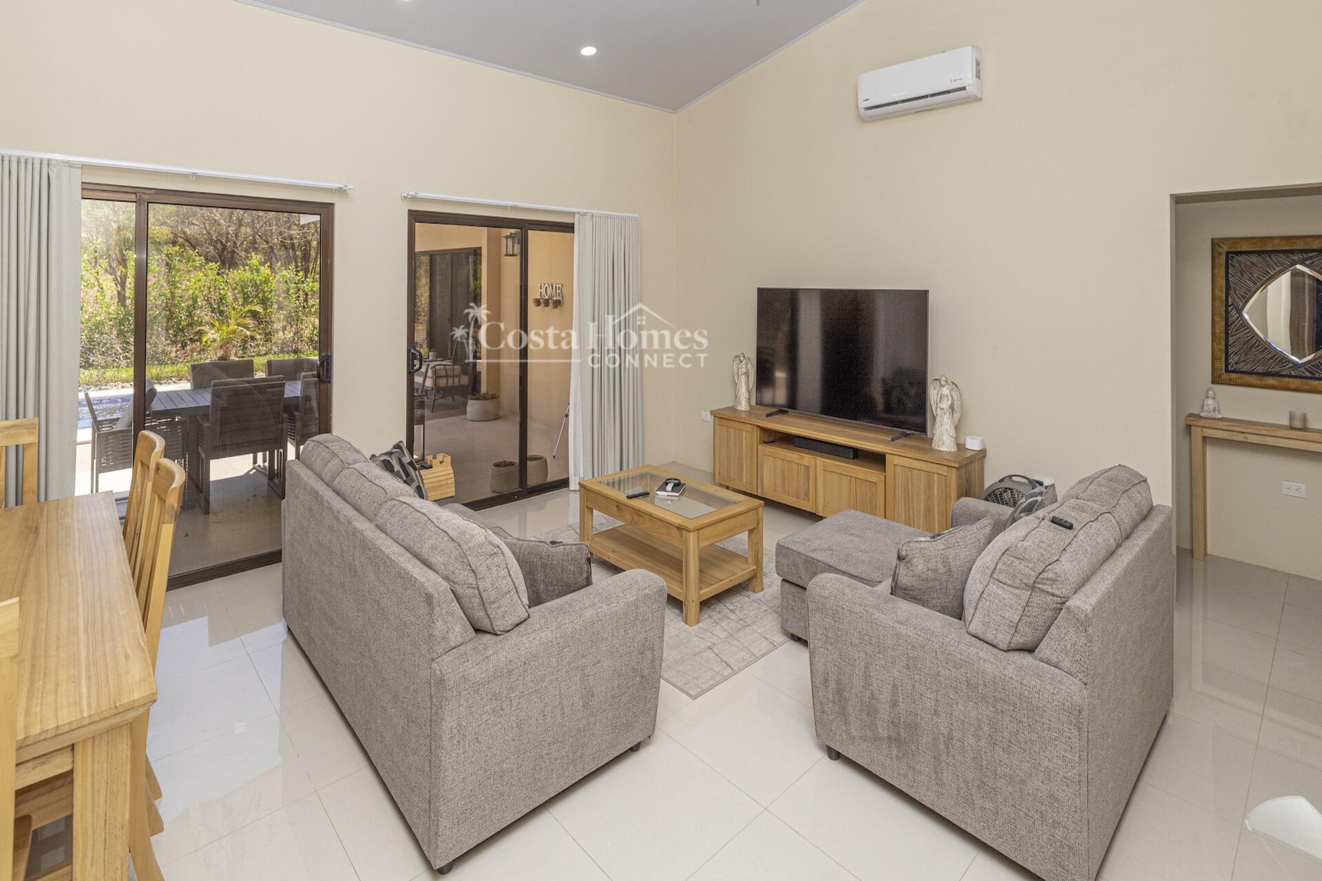 Set within the tranquil and private Vista Ridge community near Playas del Coco, this beautifully designed one-level estate home offers 3 bedrooms and 3.5 baths across 2,900 square feet including the attached garage and expansive covered terraces, all positioned on an estate-sized 6,309 square meter (1.5 acre) mostly flat lot with nature and mountain views and abundant irrigation from a private artesian well. The light and airy interior showcases light-colored custom wood cabinetry, a large chef’s kitchen with a huge center island and oversized pantry, and defined yet seamlessly connected dining and living spaces that flow effortlessly to the spacious covered terrace, oversized pool, and generous yard—perfect for indoor-outdoor living.