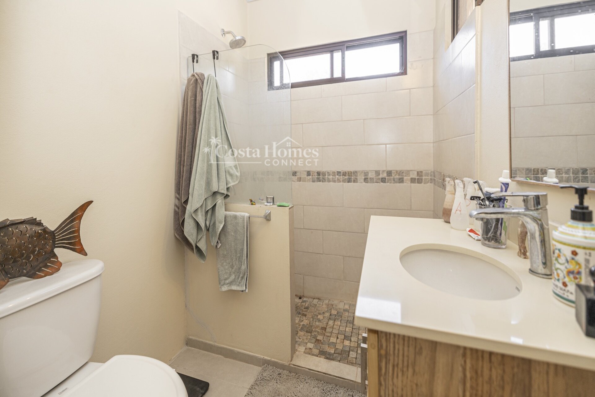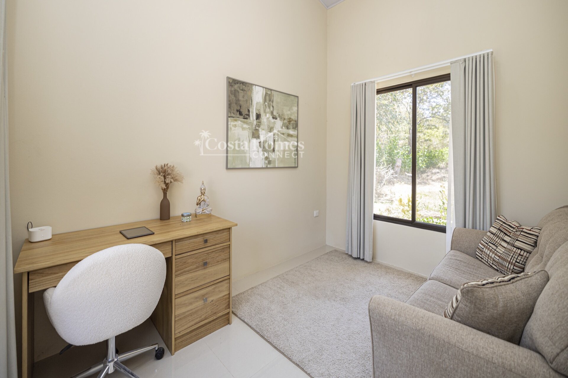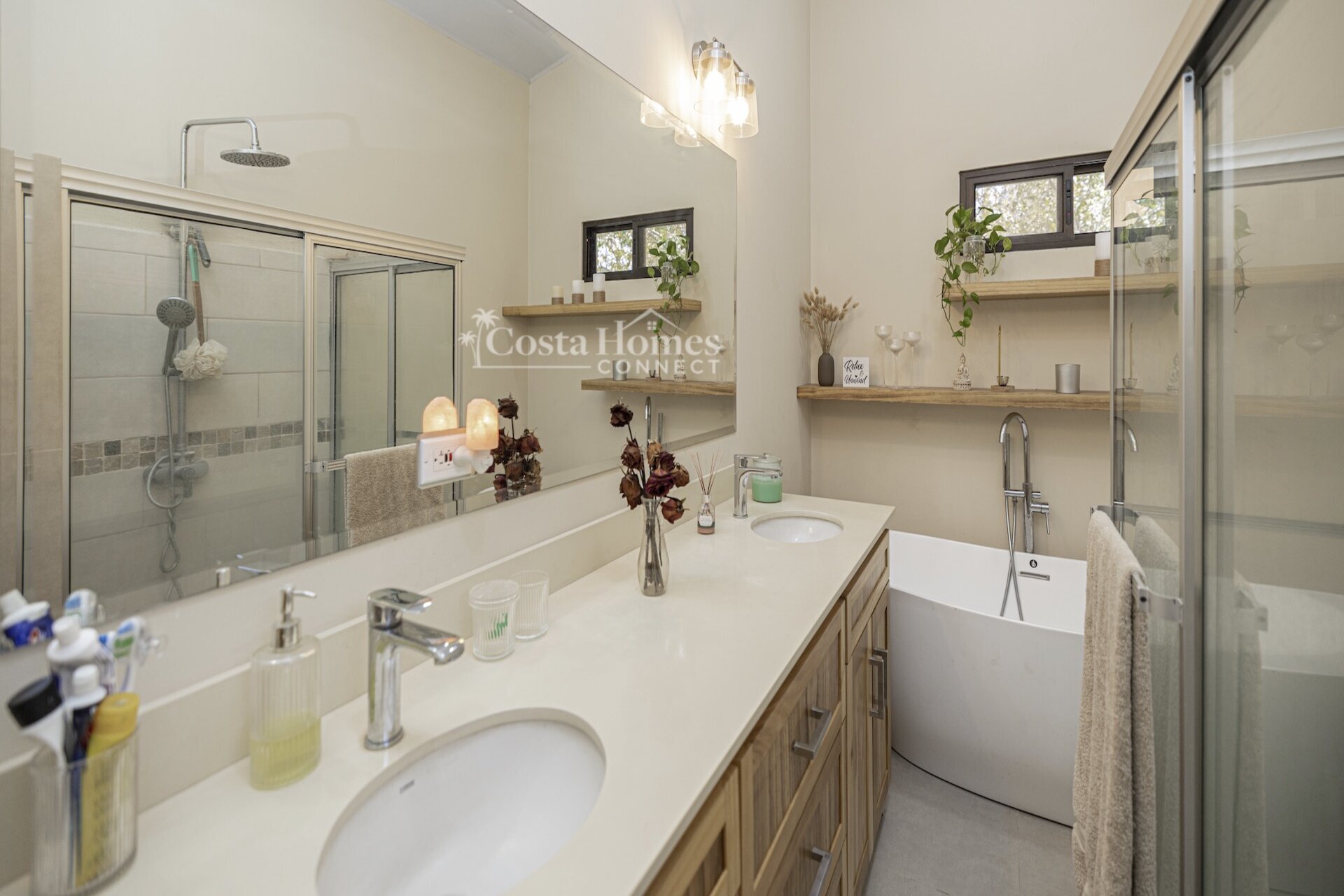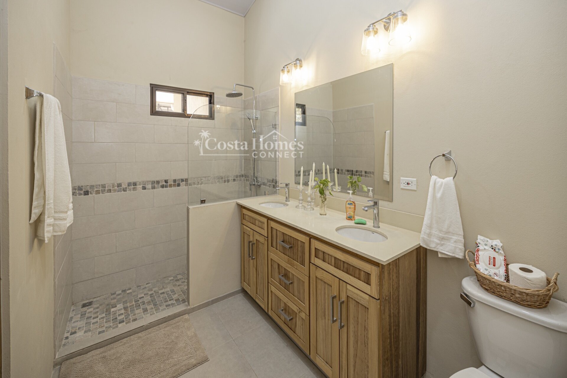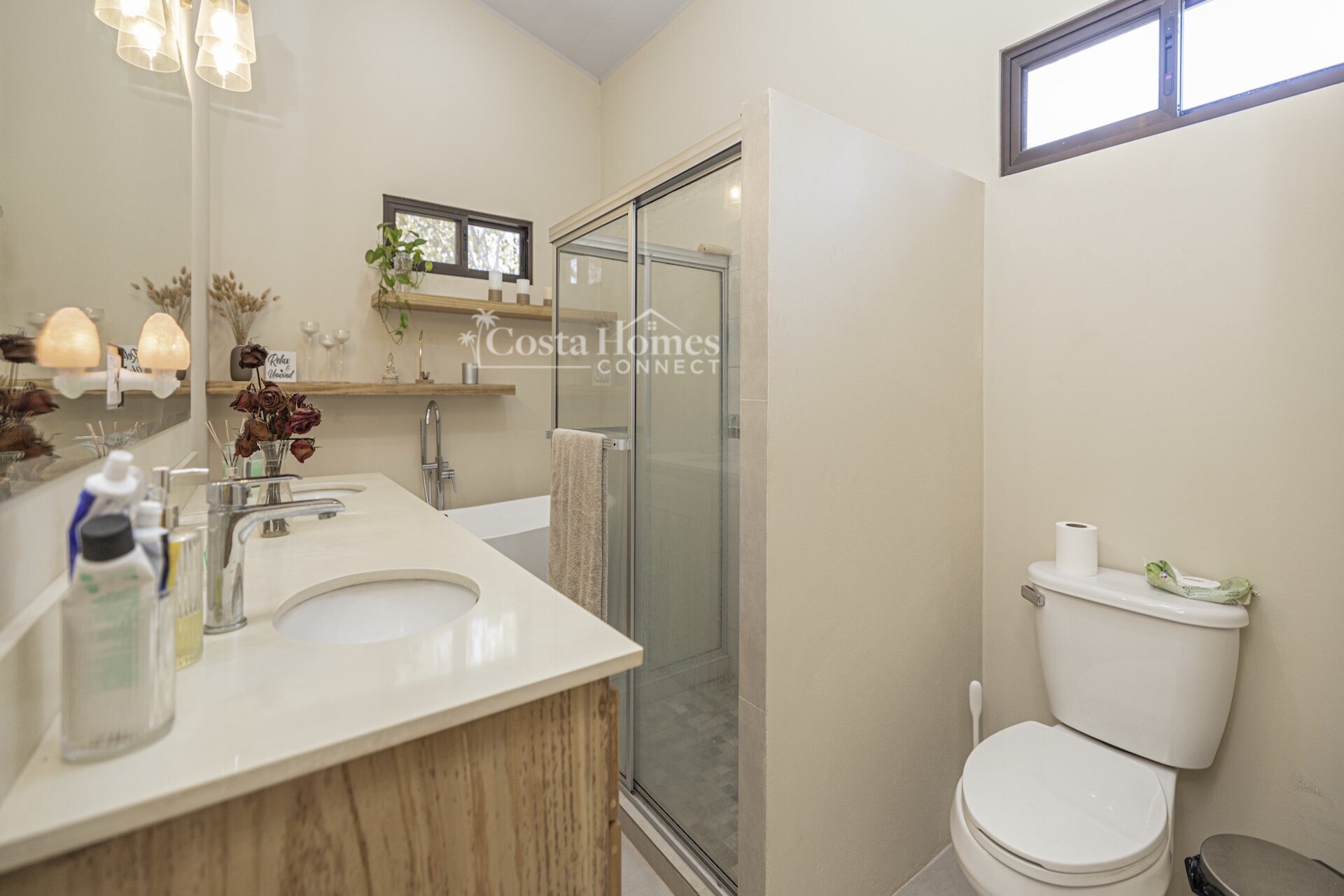 Set within the tranquil and private Vista Ridge community near Playas del Coco, this beautifully designed one-level estate home offers 3 bedrooms and 3.5 baths across 2,900 square feet including the attached garage and expansive covered terraces, all positioned on an estate-sized 6,309 square meter (1.5 acre) mostly flat lot with nature and mountain views and abundant irrigation from a private artesian well. The light and airy interior showcases light-colored custom wood cabinetry, a large chef’s kitchen with a huge center island and oversized pantry, and defined yet seamlessly connected dining and living spaces that flow effortlessly to the spacious covered terrace, oversized pool, and generous yard—perfect for indoor-outdoor living.