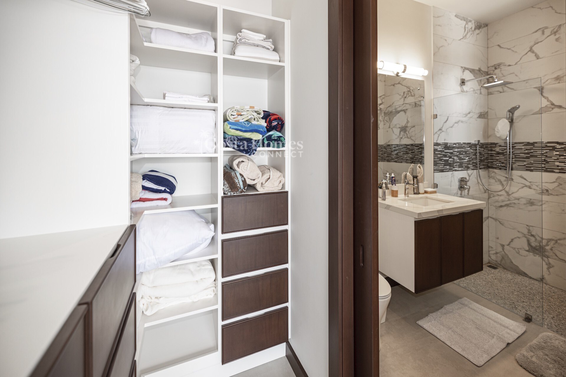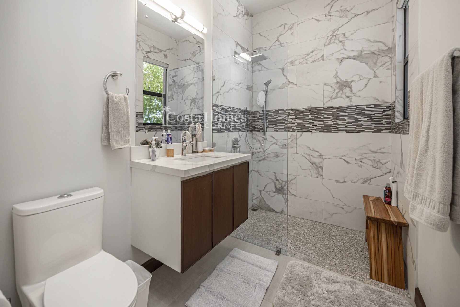 The main floor showcases a dramatic great room with soaring two-story vaulted ceilings, encompassing spacious living, dining, and kitchen areas — all oriented to maximize the spectacular ocean views and direct access to the expansive pool terrace. The chef’s kitchen is complemented by a pantry and adjacent laundry room for convenience. Two ocean-view primary suites, each with spa-like en suite bathrooms, walk-in closets, and direct terrace access, offer ultimate comfort and privacy. A versatile fifth bedroom or office has access to a nearby full bath that also serves the great room.