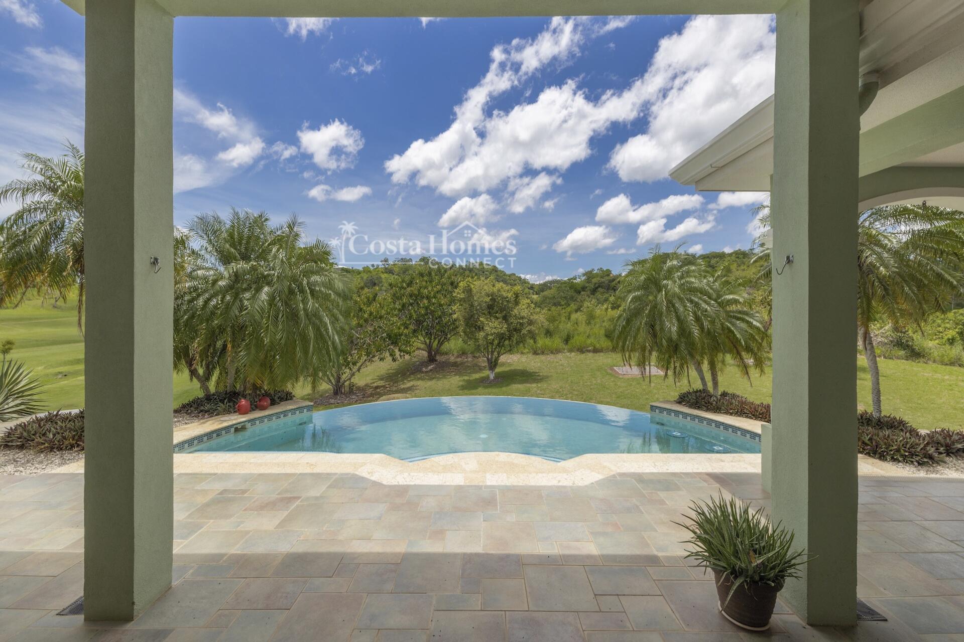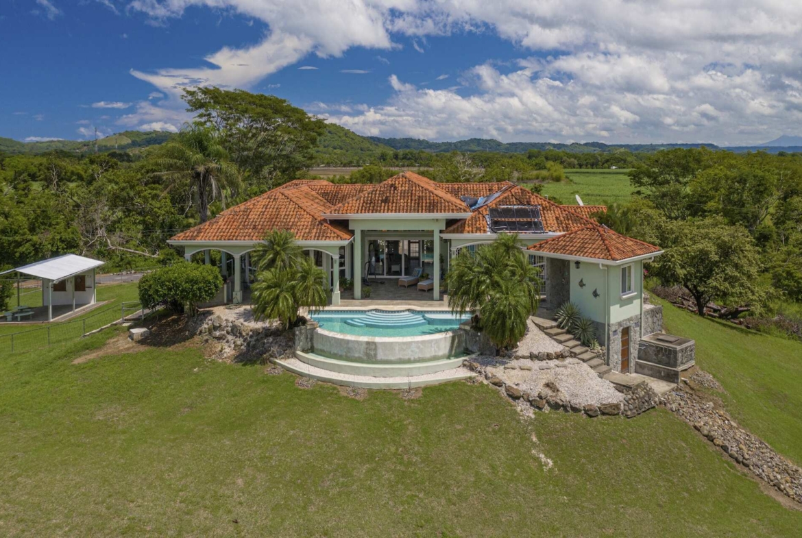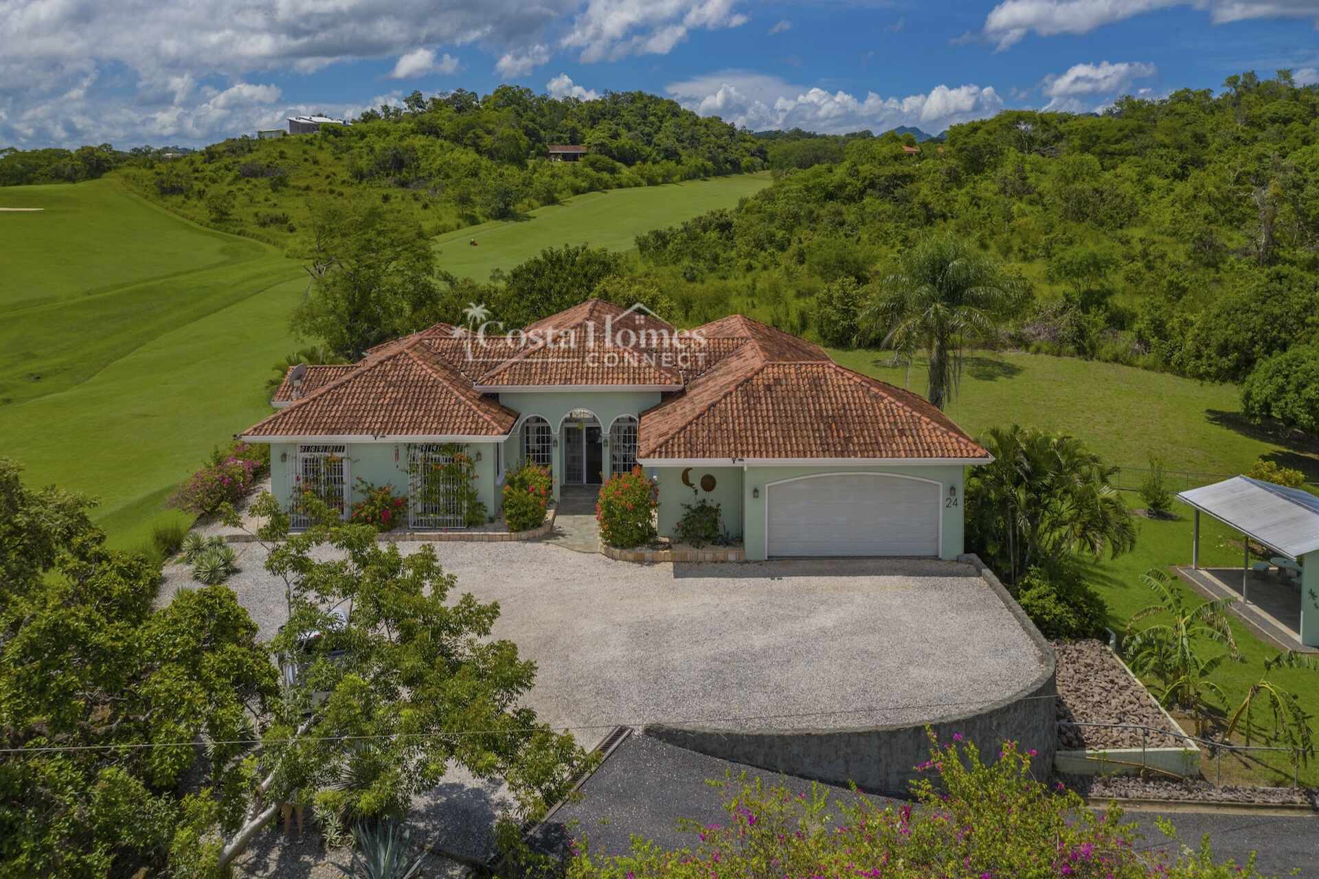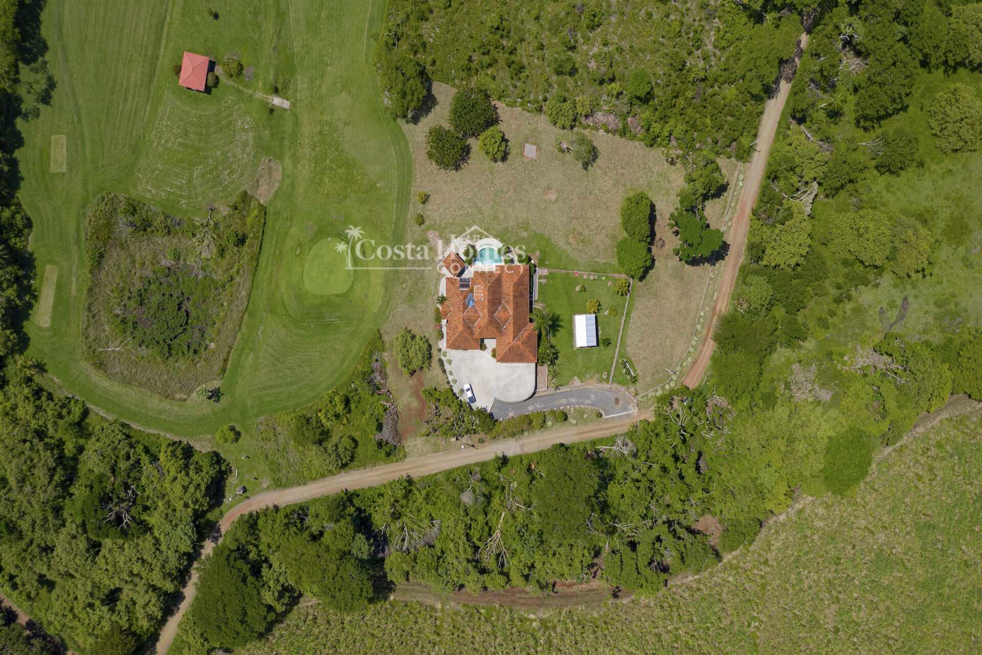 An attached double-car garage adds convenience, while the open floor plan seamlessly connects the spacious living room, kitchen, and dining area—all oriented toward spectacular views through large picture windows. Step outside to an expansive covered terrace of over 1,200 ft², complete with a BBQ area, outdoor half bath, and an infinity pool overlooking the valley, mountains, and the lush fairways of the 335-acre, 18-hole Tres Volcanes Golf Course. Set atop a scenic knoll on 10,288 m² (2.5 acres), the home enjoys constant breezes, captivating sunrises over the volcanoes, and unforgettable sunsets across the manicured grounds and greens. The beautifully landscaped grounds feature mature fruit trees, native plants, and a diverse array of local tree species, creating a vibrant natural environment that attracts abundant wildlife for you to enjoy right from your doorstep. Inside, the large primary suite provides a private retreat with a walk-in closet, double vanity, separate tub, and shower, while additional highlights include a generous laundry/utility room with ample storage, a fenced area ideal for dogs, and a covered outdoor game pavilion.