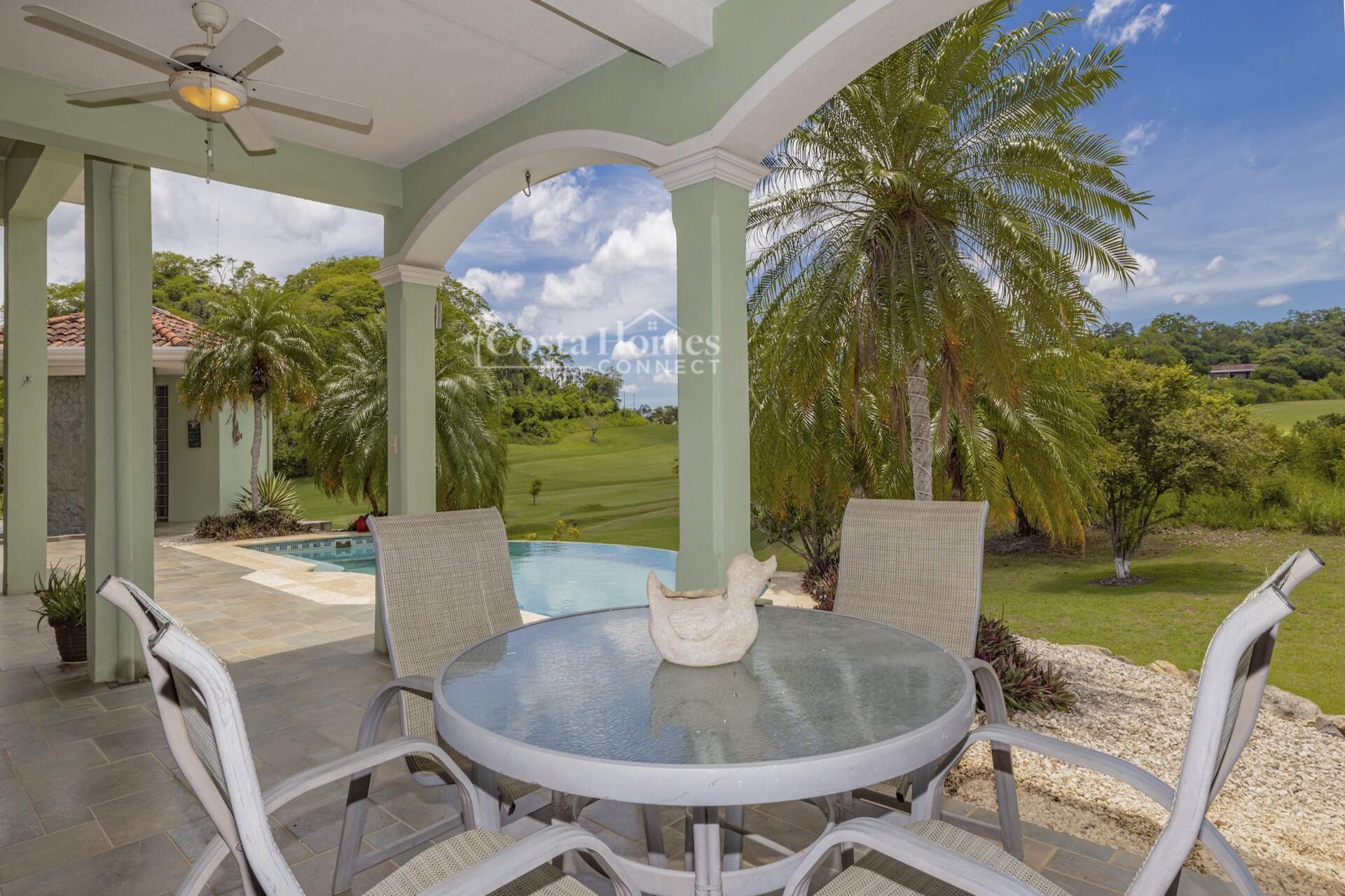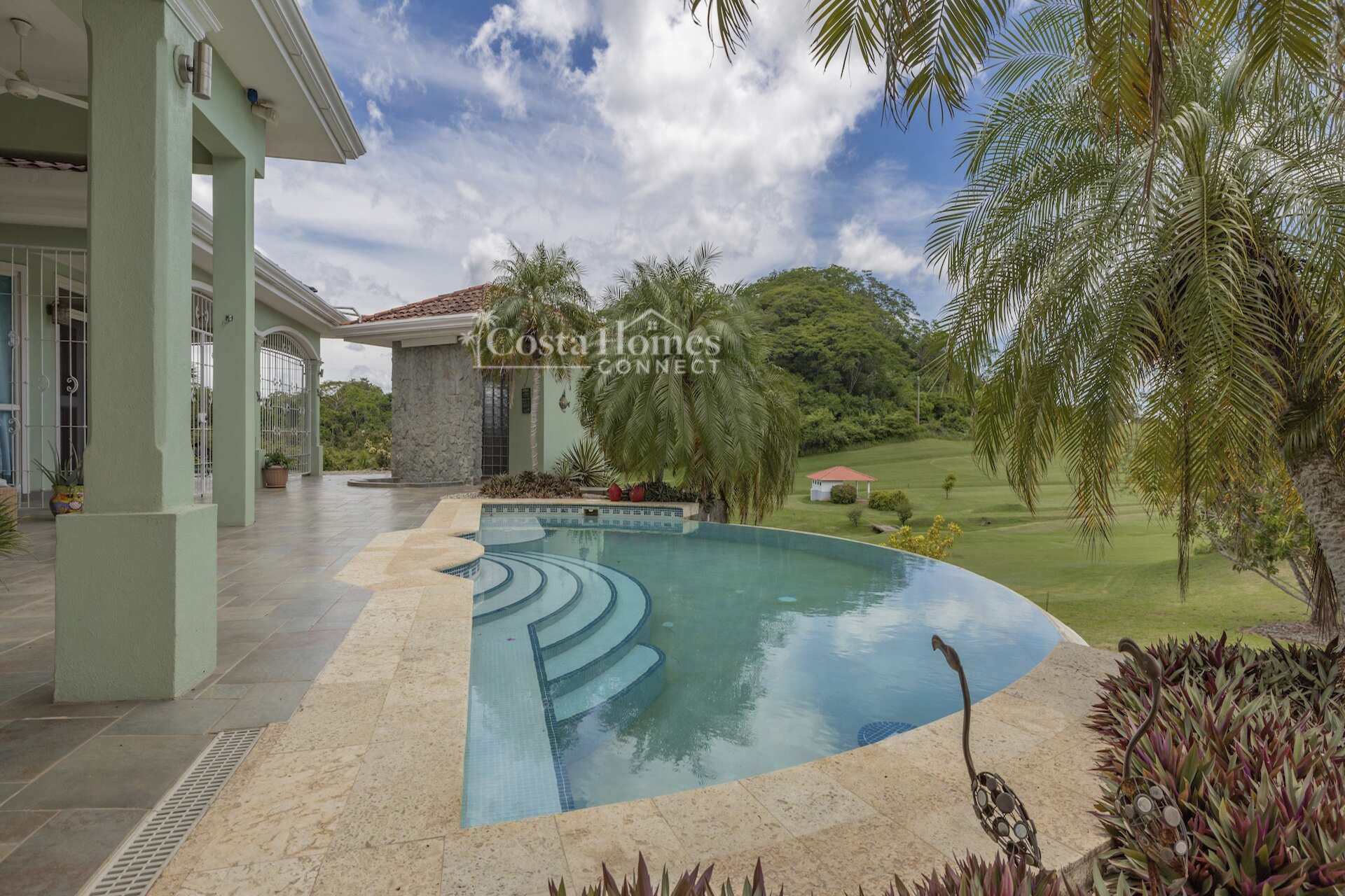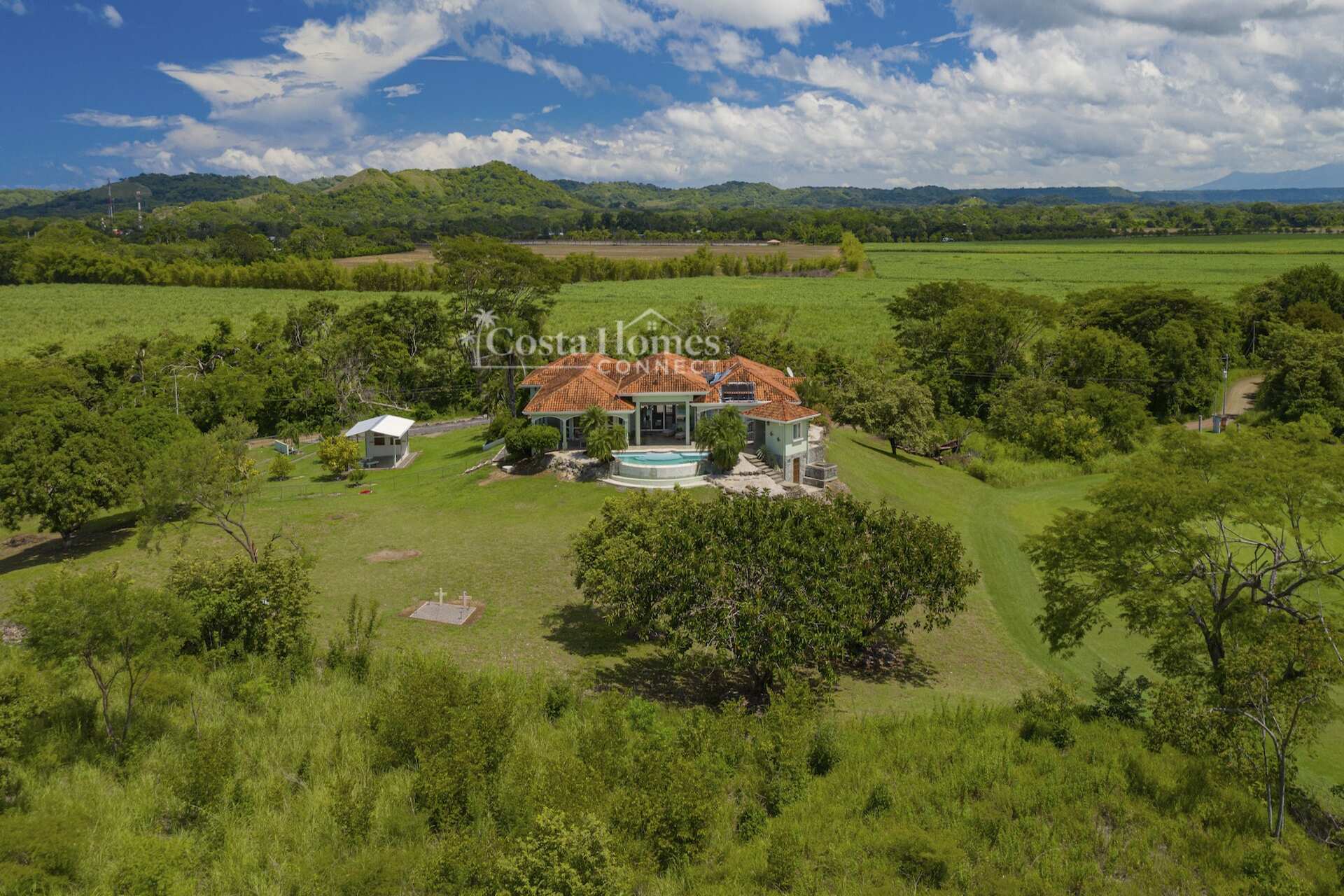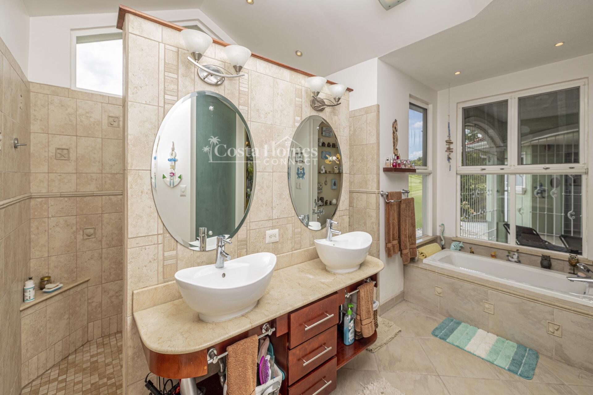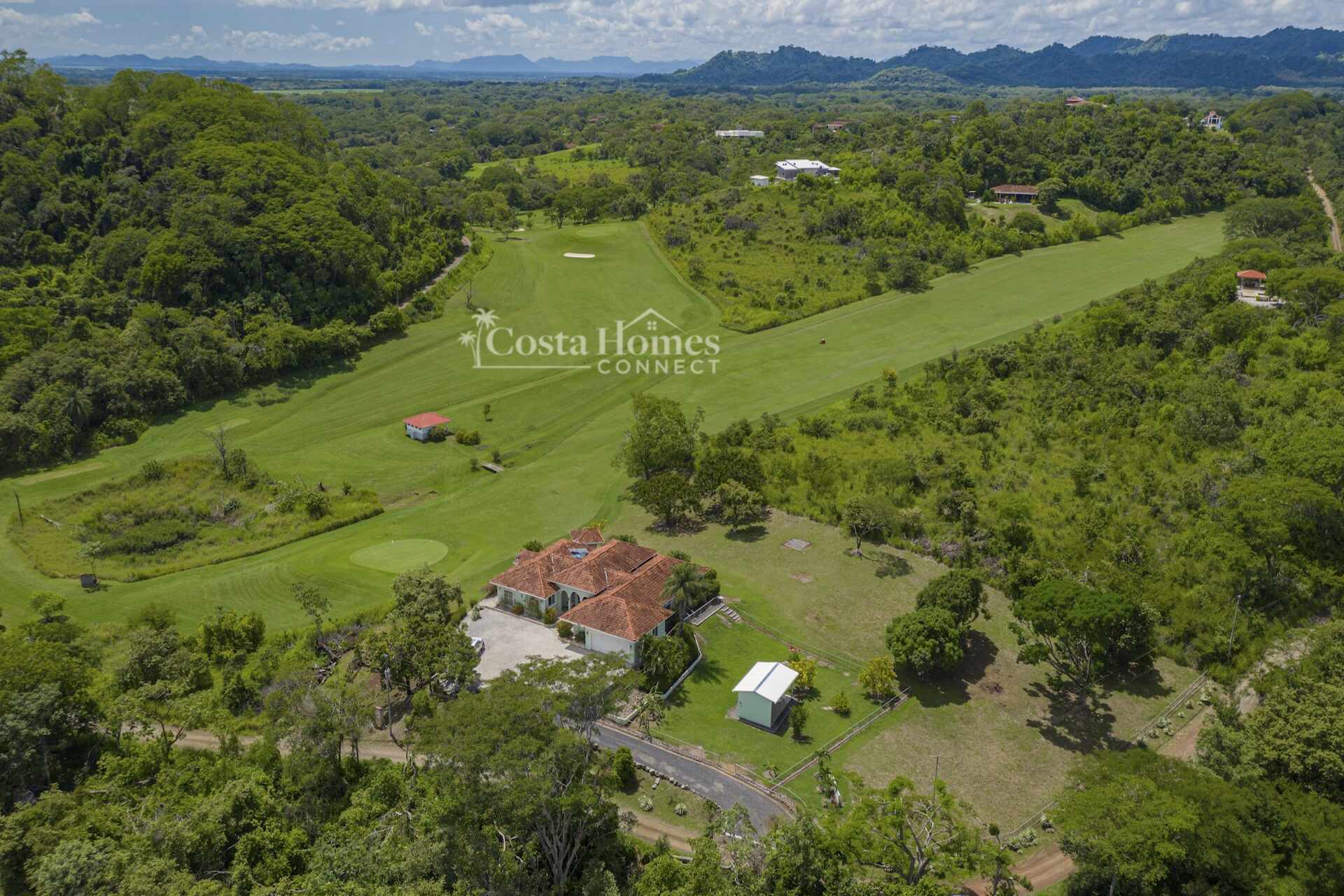 An attached double-car garage adds convenience, while the open floor plan seamlessly connects the spacious living room, kitchen, and dining area—all oriented toward spectacular views through large picture windows. Step outside to an expansive covered terrace of over 1,200 ft², complete with a BBQ area, outdoor half bath, and an infinity pool overlooking the valley, mountains, and the lush fairways of the 335-acre, 18-hole Tres Volcanes Golf Course. Set atop a scenic knoll on 10,288 m² (2.5 acres), the home enjoys constant breezes, captivating sunrises over the volcanoes, and unforgettable sunsets across the manicured grounds and greens. The beautifully landscaped grounds feature mature fruit trees, native plants, and a diverse array of local tree species, creating a vibrant natural environment that attracts abundant wildlife for you to enjoy right from your doorstep. Inside, the large primary suite provides a private retreat with a walk-in closet, double vanity, separate tub, and shower, while additional highlights include a generous laundry/utility room with ample storage, a fenced area ideal for dogs, and a covered outdoor game pavilion.