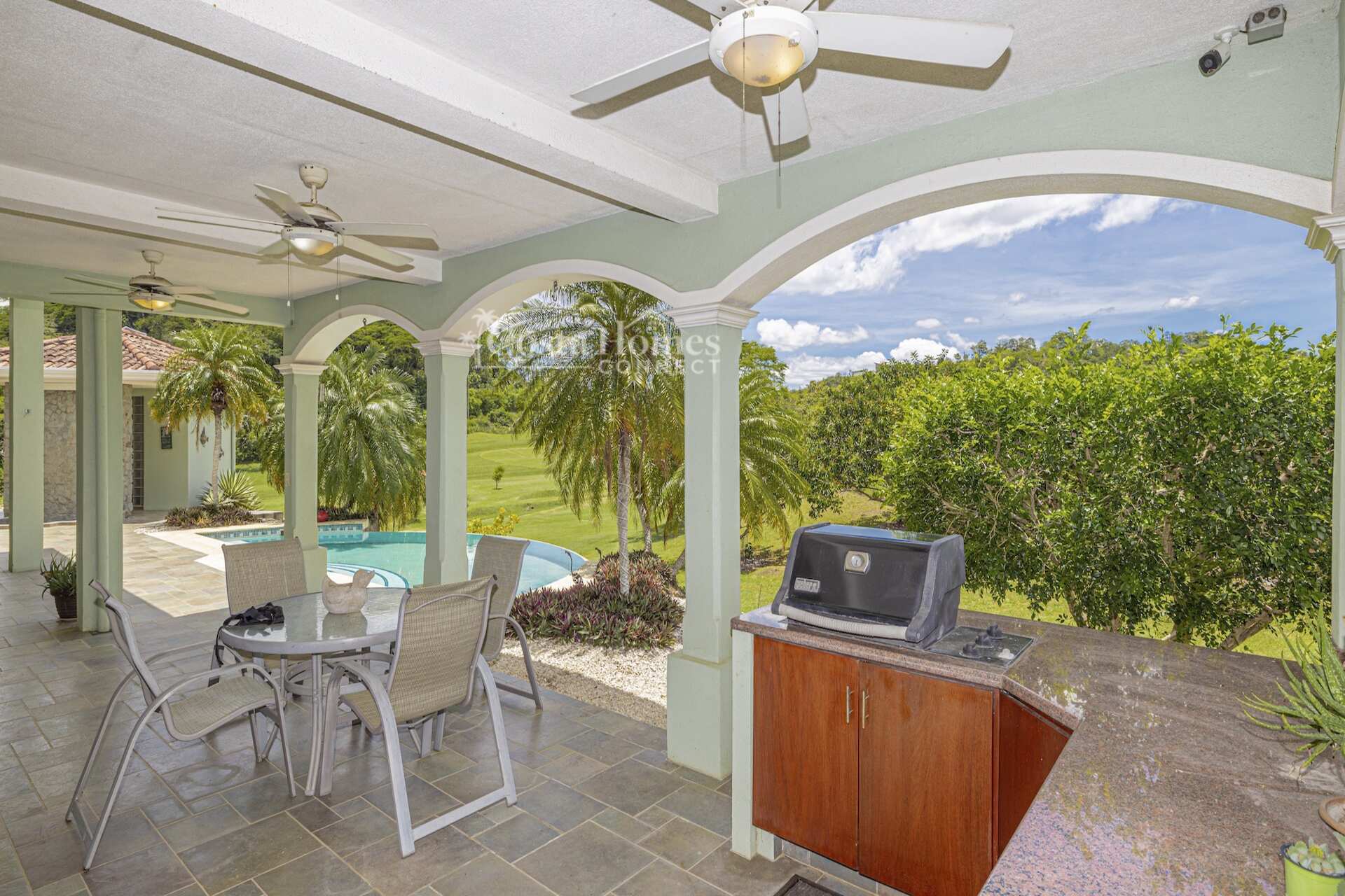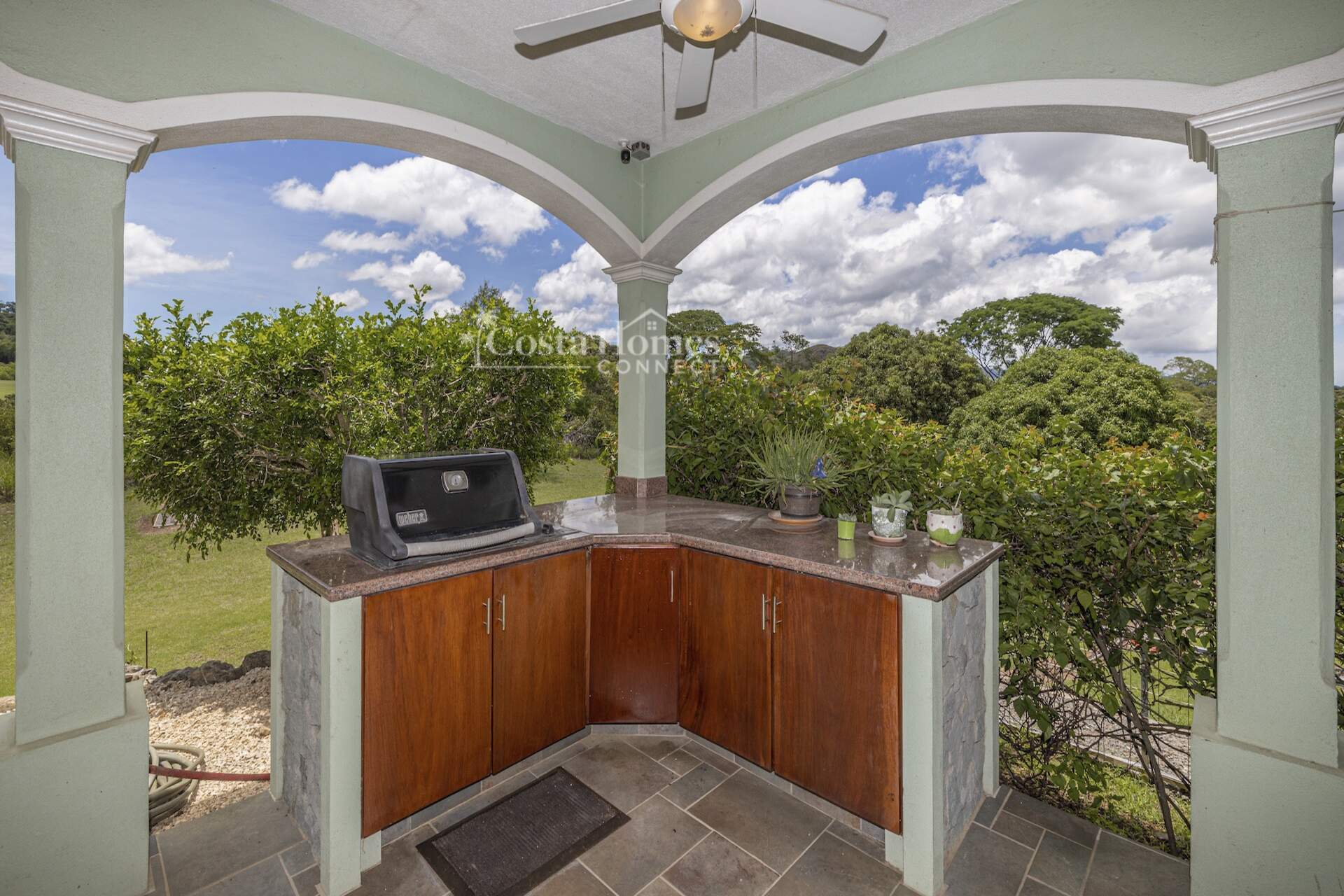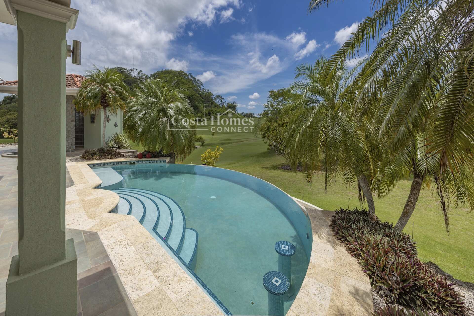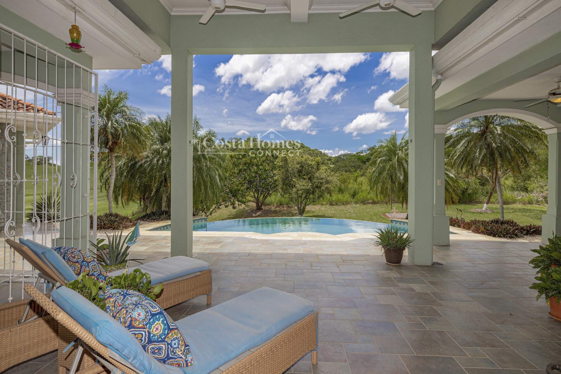An attached double-car garage adds convenience, while the open floor plan seamlessly connects the spacious living room, kitchen, and dining area—all oriented toward spectacular views through large picture windows. Step outside to an expansive covered terrace of over 1,200 ft², complete with a BBQ area, outdoor half bath, and an infinity pool overlooking the valley, mountains, and the lush fairways of the 335-acre, 18-hole Tres Volcanes Golf Course. Set atop a scenic knoll on 10,288 m² (2.5 acres), the home enjoys constant breezes, captivating sunrises over the volcanoes, and unforgettable sunsets across the manicured grounds and greens. The beautifully landscaped grounds feature mature fruit trees, native plants, and a diverse array of local tree species, creating a vibrant natural environment that attracts abundant wildlife for you to enjoy right from your doorstep. Inside, the large primary suite provides a private retreat with a walk-in closet, double vanity, separate tub, and shower, while additional highlights include a generous laundry/utility room with ample storage, a fenced area ideal for dogs, and a covered outdoor game pavilion.