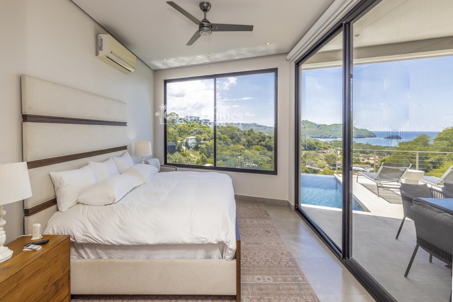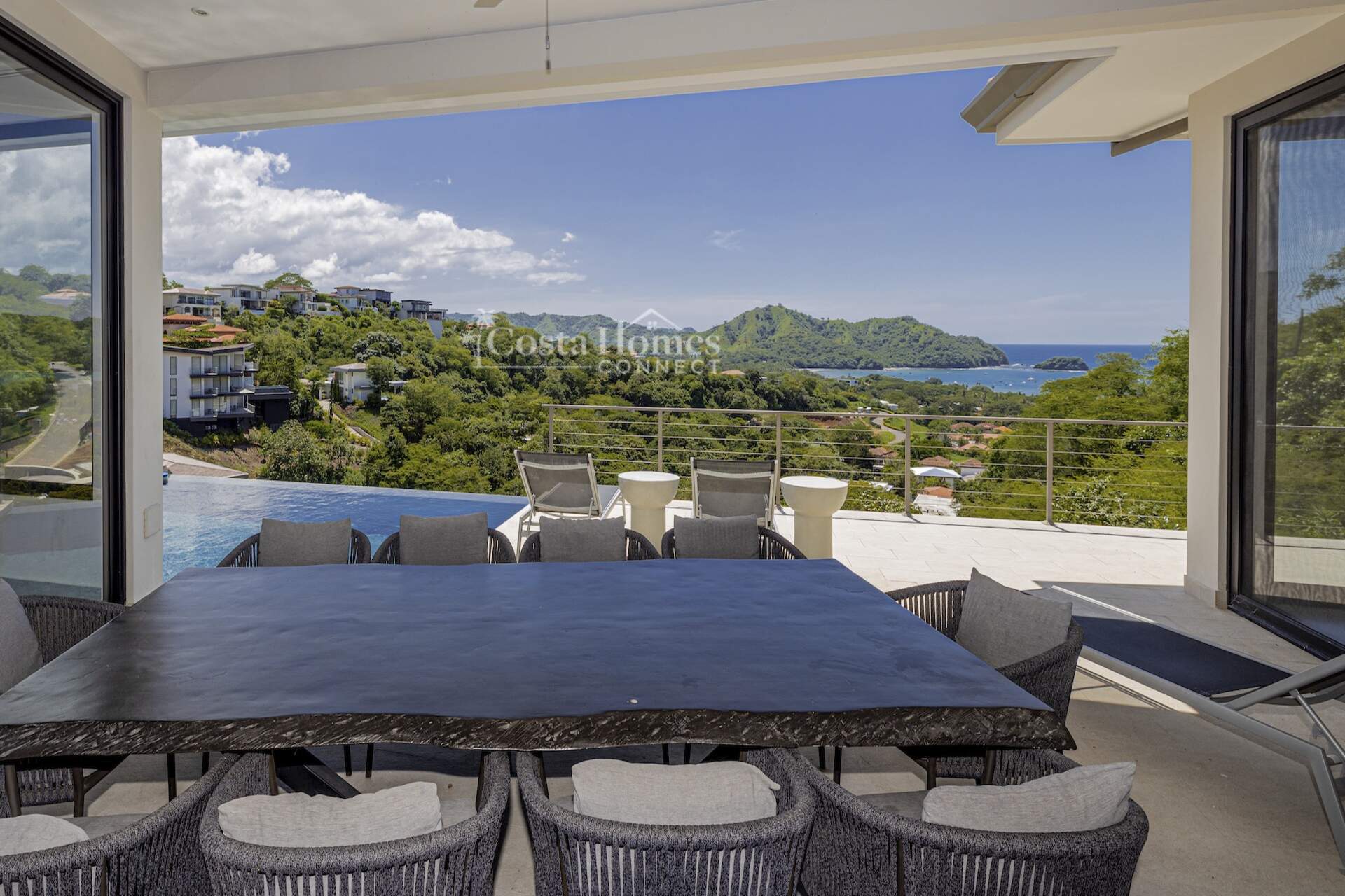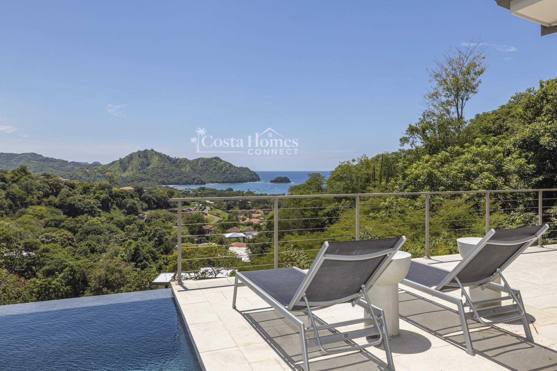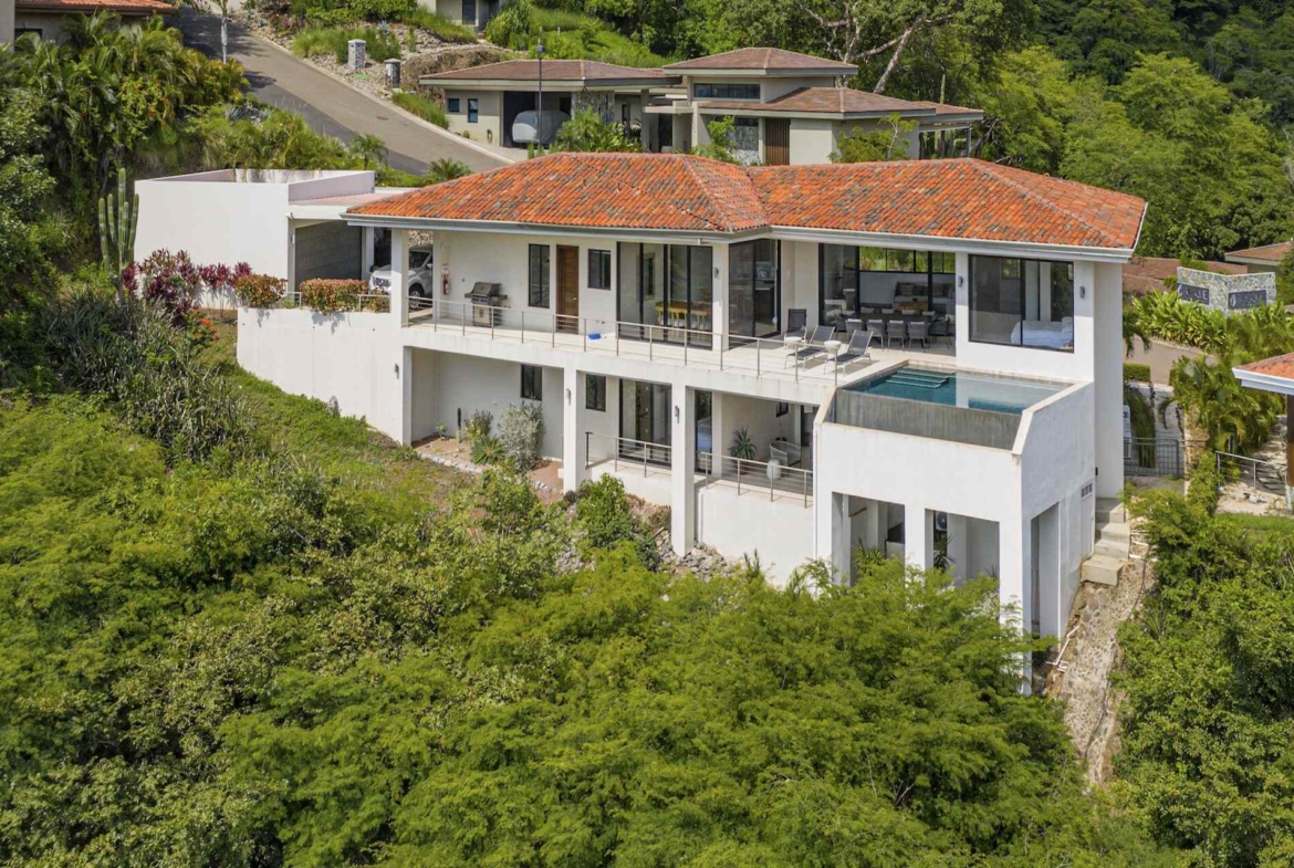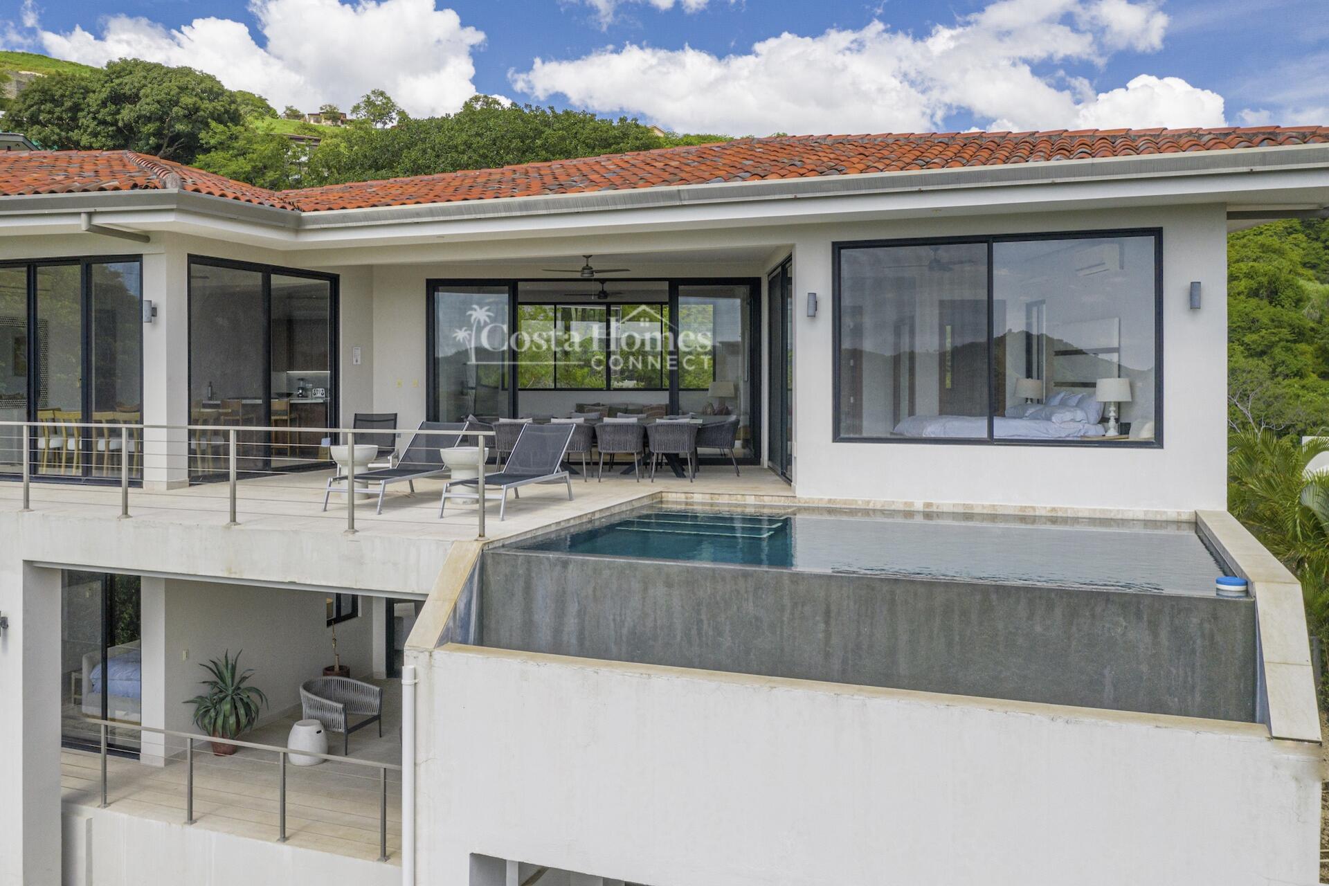 The main floor showcases a separate kitchen and an ocean view dining room that flows into a spacious living room, where panoramic views extend across the ocean and the lush forest behind. From here, glass doors open onto a covered terrace and infinity-edge pool, complete with outdoor dining, sunbathing and shaded lounging areas, and a BBQ zone—perfect for entertaining or relaxing in style. The lower level offers two additional master suites that share a large covered terrace, as well as a private 1-bedroom apartment with its own entrance, ideal for hosting guests or generating rental income. Enjoying sweeping views over Playas del Coco, this contemporary home offers 2,652 square feet of interior living space, with a total of 4,490 square feet including covered terraces and a detached 2-car garage. Fully furnished and fitted for immediate occupancy, it is built to the highest standards with upscale finishes, fixtures, and materials.