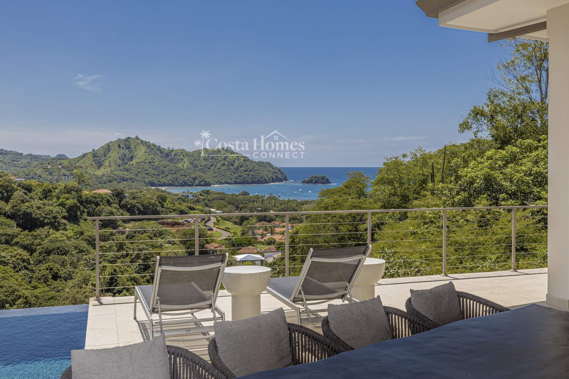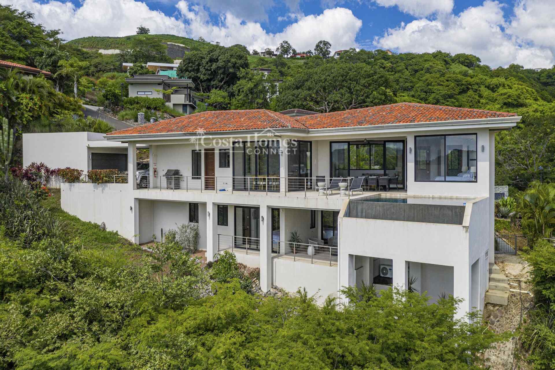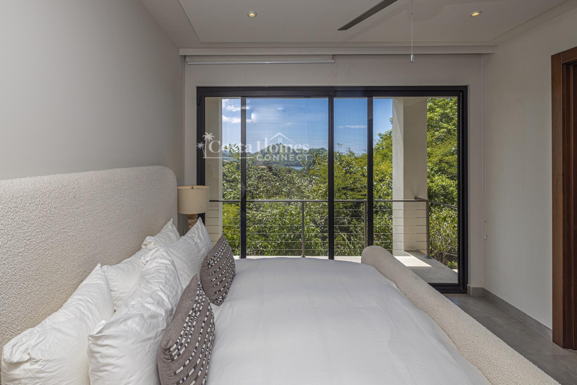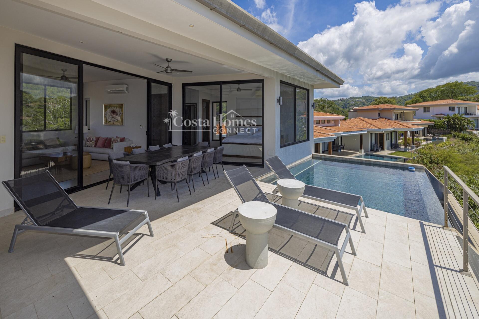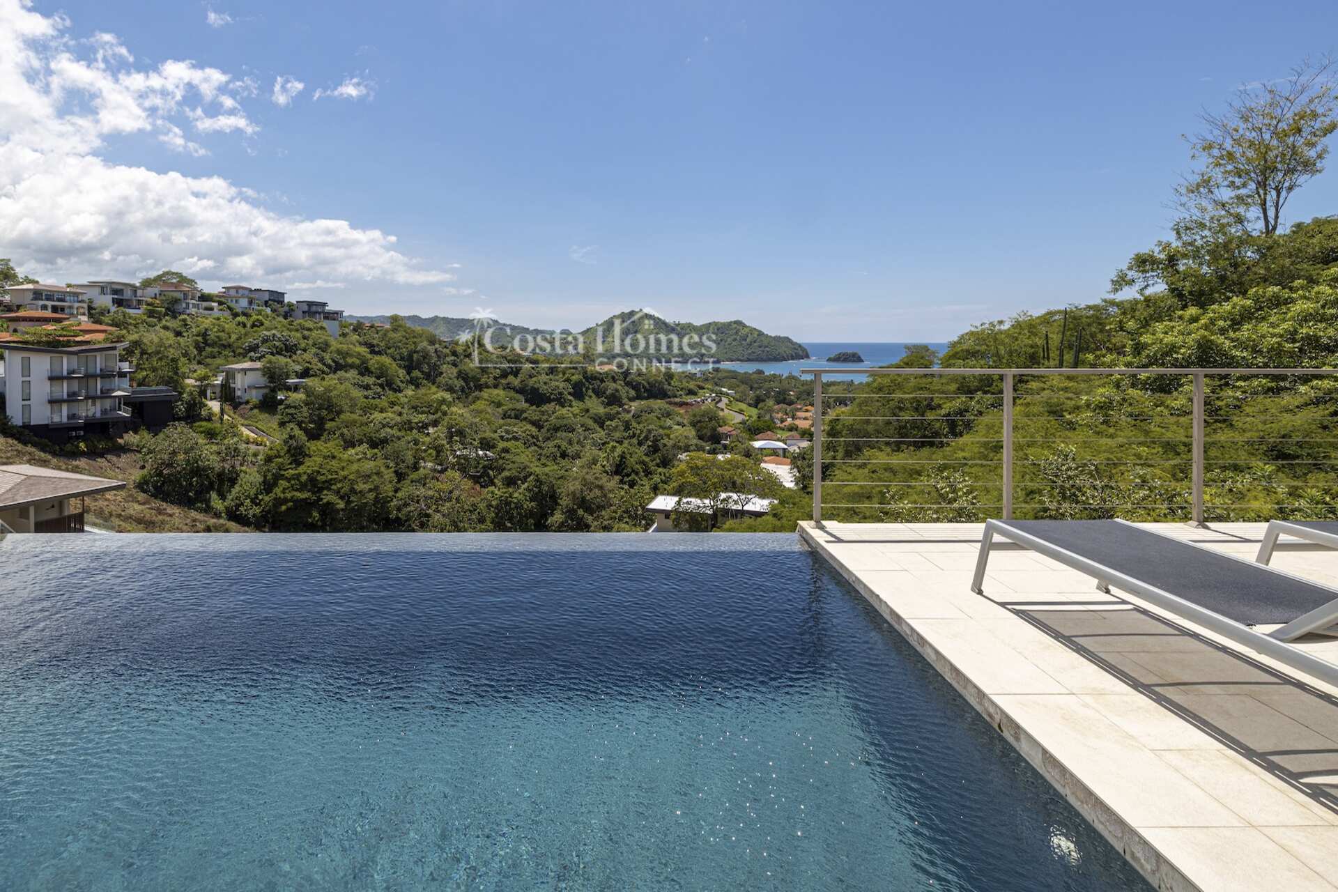 The main floor showcases a separate kitchen and an ocean view dining room that flows into a spacious living room, where panoramic views extend across the ocean and the lush forest behind. From here, glass doors open onto a covered terrace and infinity-edge pool, complete with outdoor dining, sunbathing and shaded lounging areas, and a BBQ zone—perfect for entertaining or relaxing in style. The lower level offers two additional master suites that share a large covered terrace, as well as a private 1-bedroom apartment with its own entrance, ideal for hosting guests or generating rental income. Enjoying sweeping views over Playas del Coco, this contemporary home offers 2,652 square feet of interior living space, with a total of 4,490 square feet including covered terraces and a detached 2-car garage. Fully furnished and fitted for immediate occupancy, it is built to the highest standards with upscale finishes, fixtures, and materials.