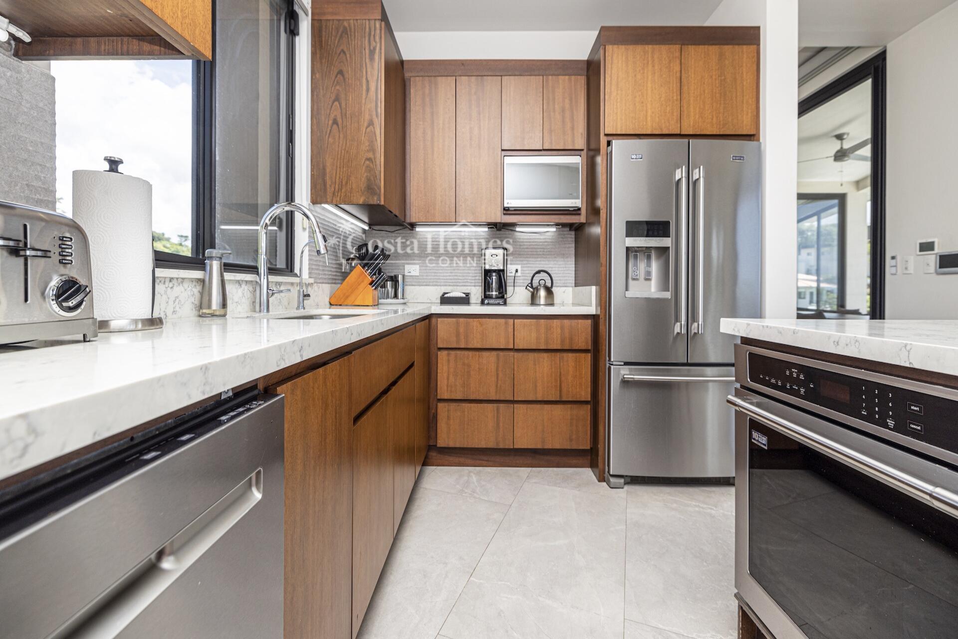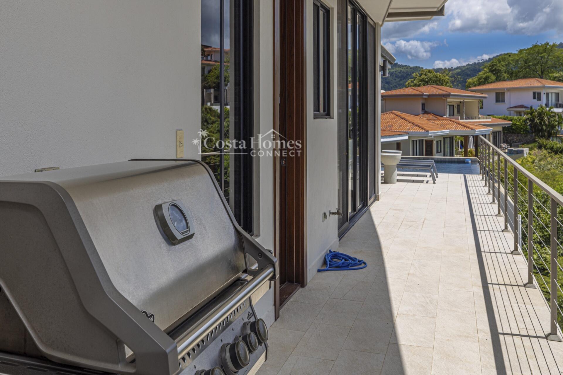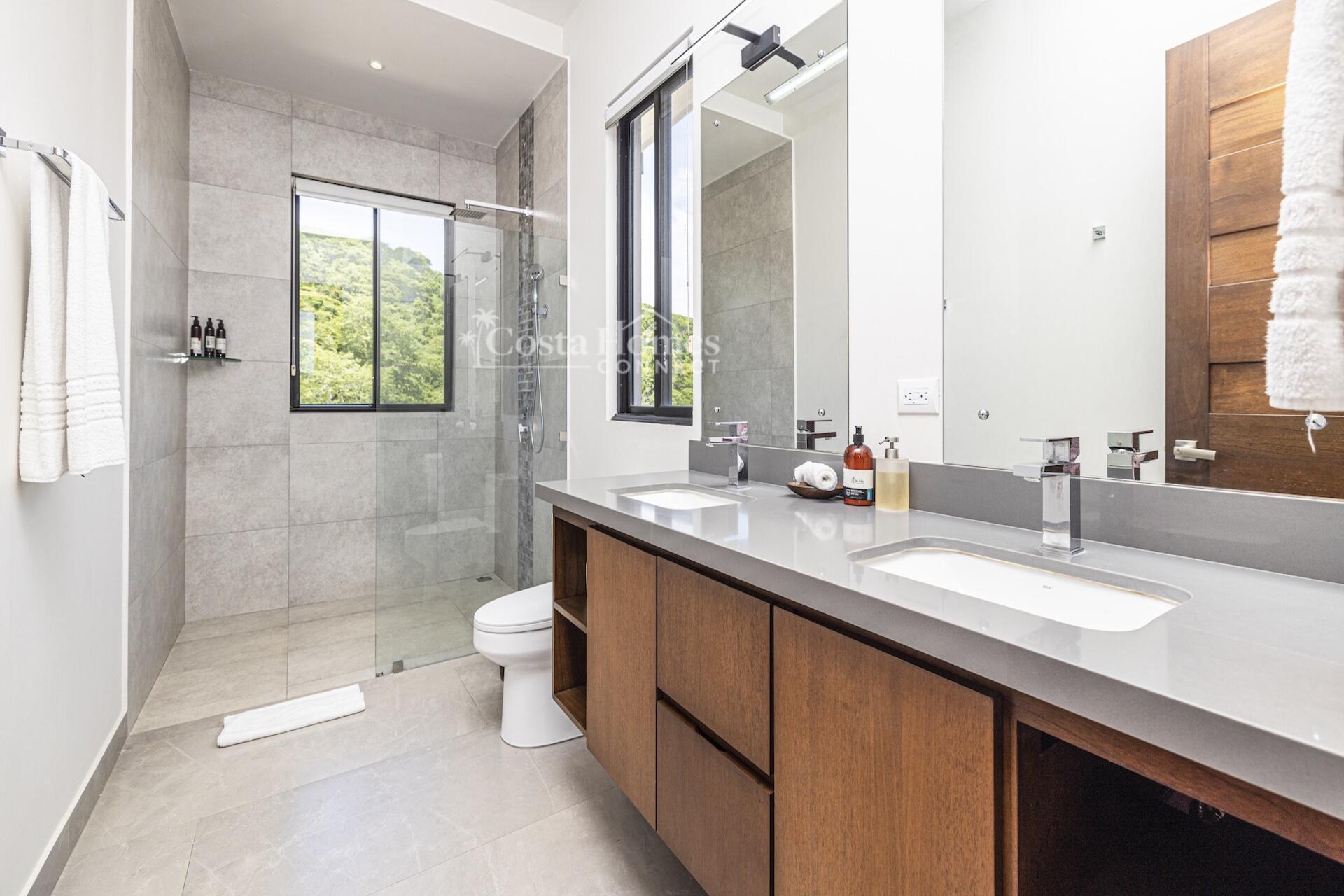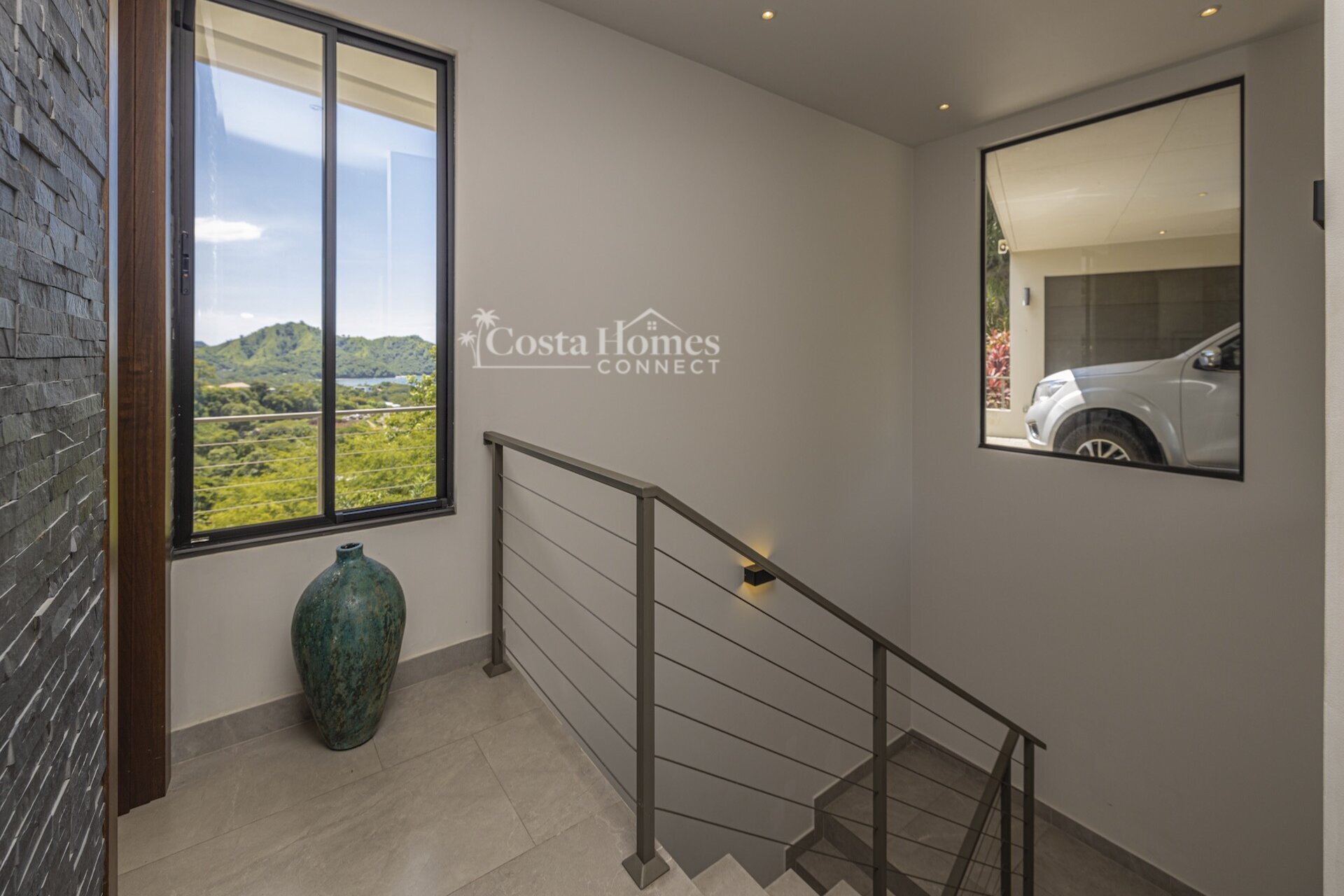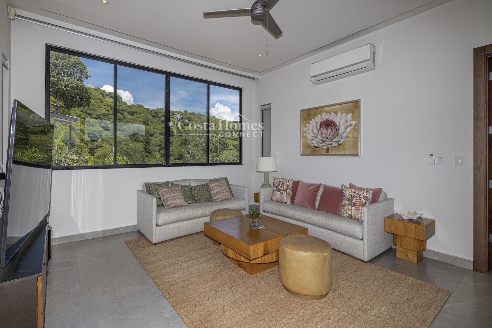 The main floor showcases a separate kitchen and an ocean view dining room that flows into a spacious living room, where panoramic views extend across the ocean and the lush forest behind. From here, glass doors open onto a covered terrace and infinity-edge pool, complete with outdoor dining, sunbathing and shaded lounging areas, and a BBQ zone—perfect for entertaining or relaxing in style. The lower level offers two additional master suites that share a large covered terrace, as well as a private 1-bedroom apartment with its own entrance, ideal for hosting guests or generating rental income. Enjoying sweeping views over Playas del Coco, this contemporary home offers 2,652 square feet of interior living space, with a total of 4,490 square feet including covered terraces and a detached 2-car garage. Fully furnished and fitted for immediate occupancy, it is built to the highest standards with upscale finishes, fixtures, and materials.