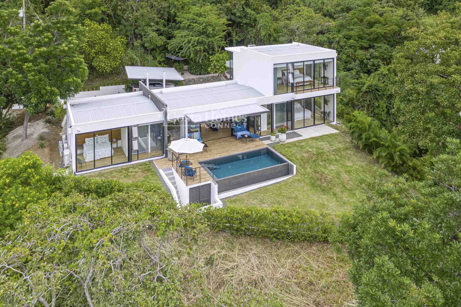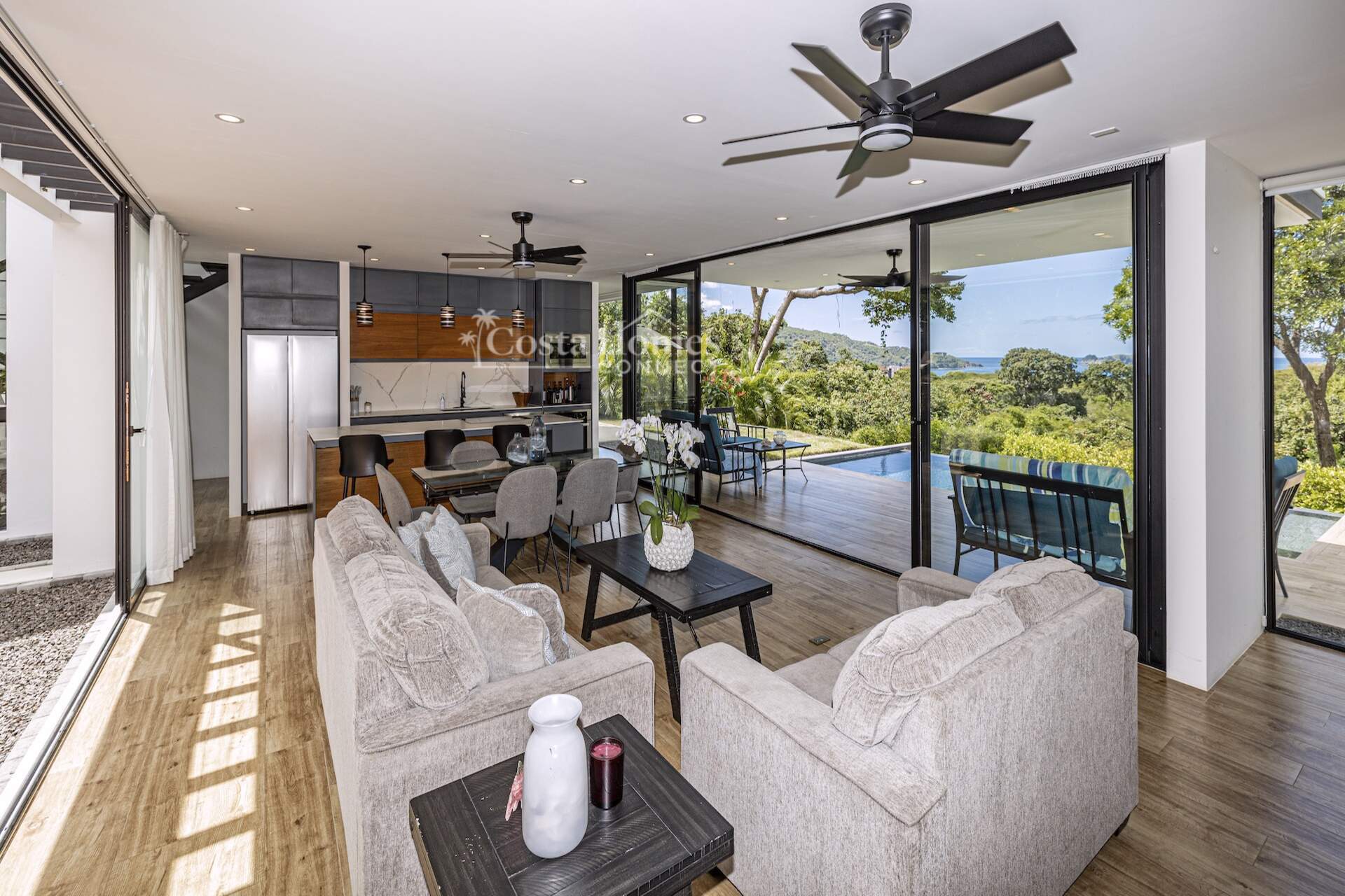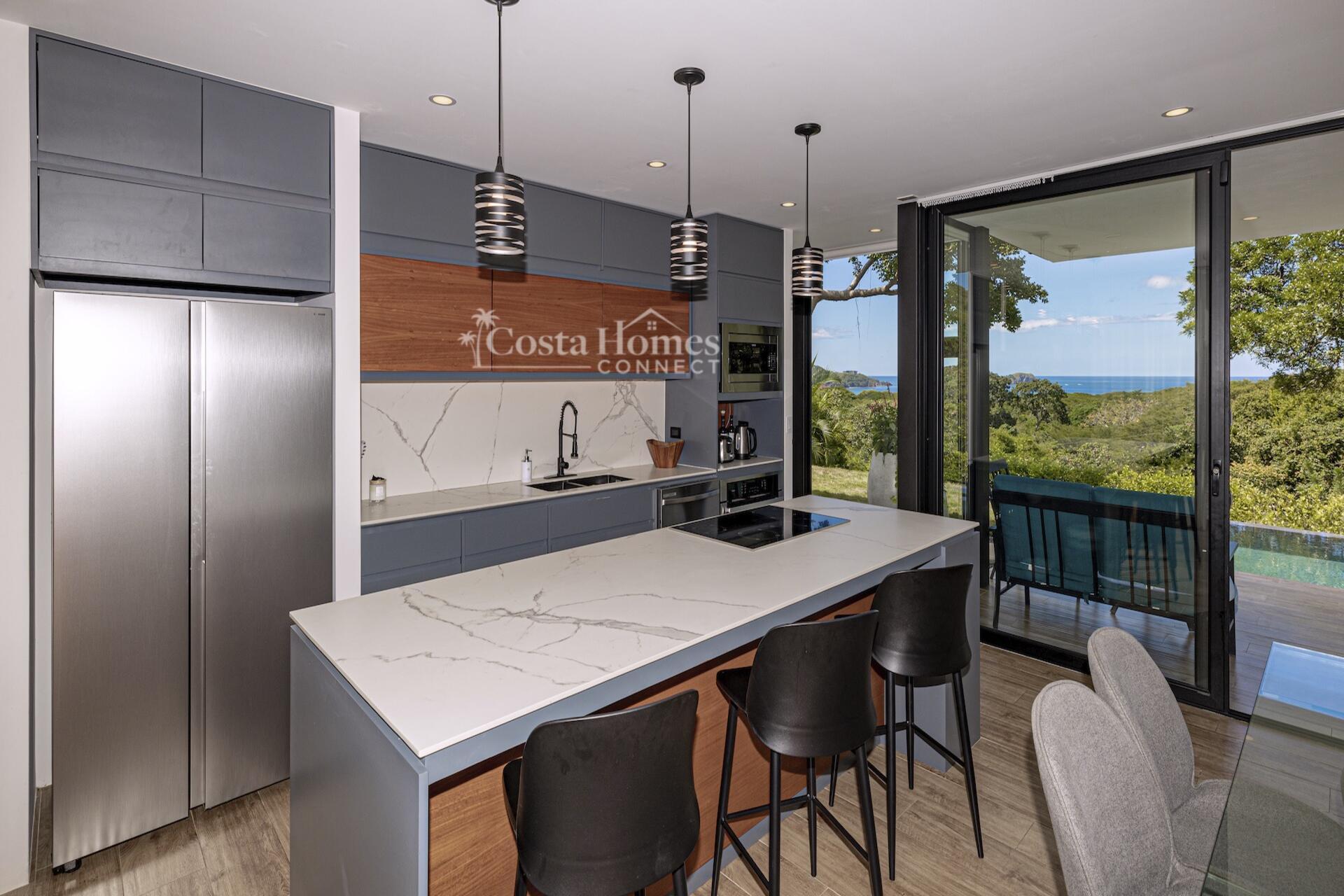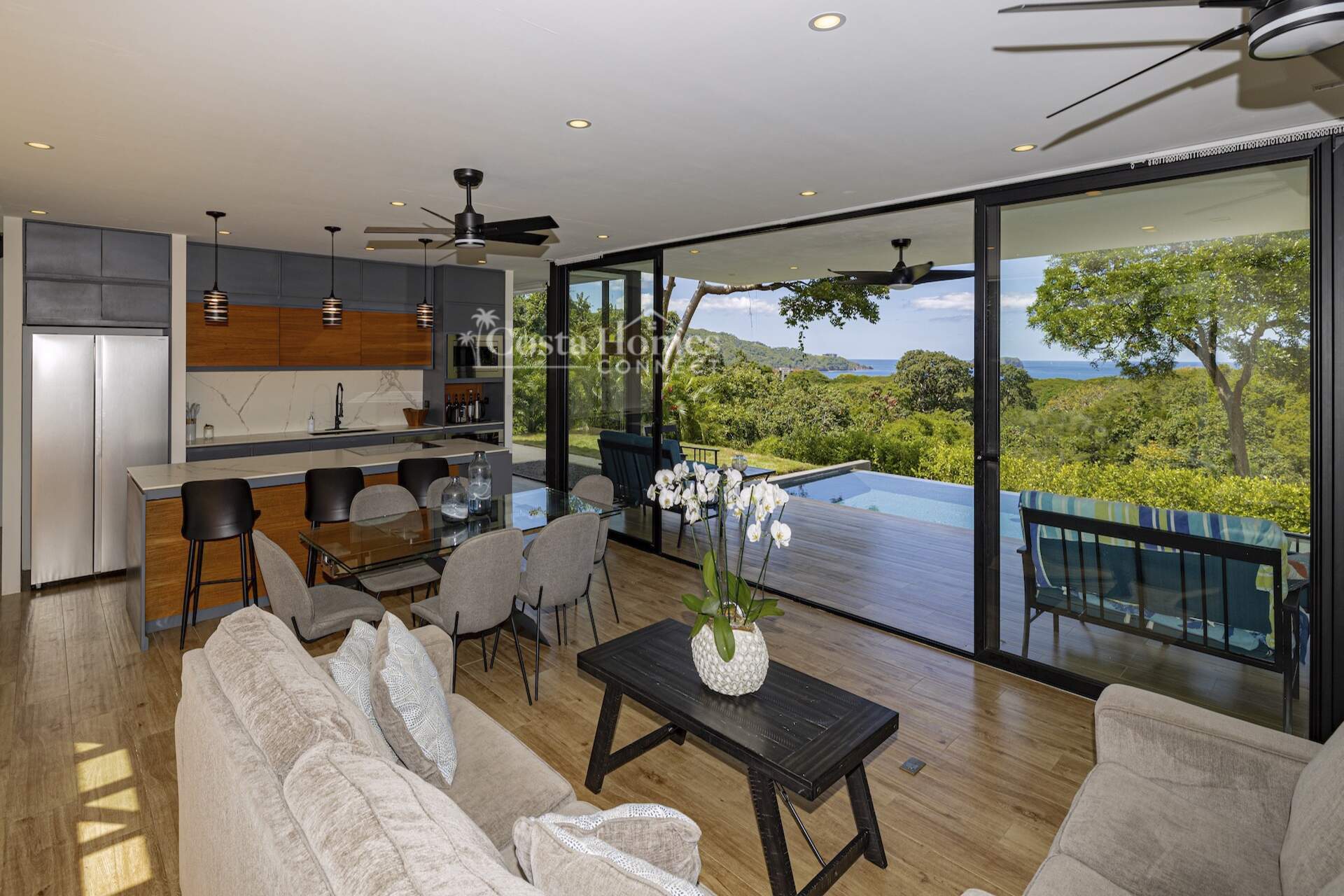 This stunning modern masterpiece offers luxurious indoor–outdoor living, beautiful ocean views, and exceptional privacy within the prestigious low-density gated community of Palo Alto, just a short walk to the Blue Flag shores of Playa Hermosa. Situated on a 1,035m² lot and spanning 2,600 square feet, this fully furnished 4-bed, 4.5-bath contemporary residence features an entertainer’s main level with an expansive open-concept living, dining, and chef’s kitchen area framed by floor-to-ceiling windows and sliding glass doors that open to ocean-view terraces, private gardens, and an inviting infinity pool overlooking Playa Hermosa and the Gulf of Papagayo.